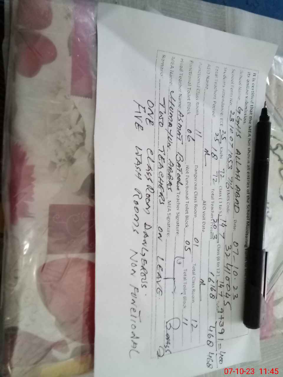 | Remarks (Use Separate Page if Required): Two teachers on leave one class room dangerous five Wash rooms non functional overall cleaness good | |||||