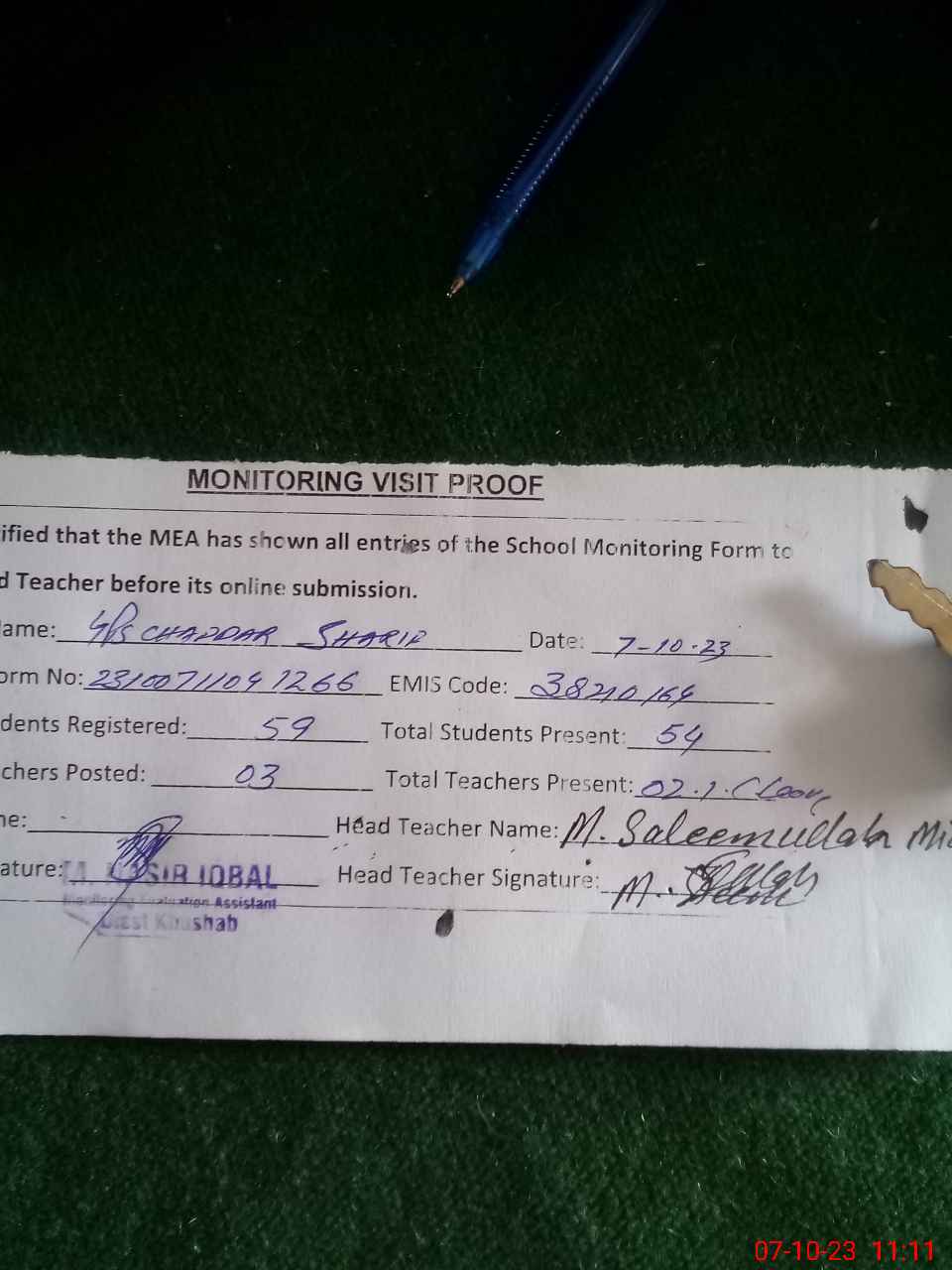 | Attendance Register | Head Teacher | MEA with School | Visit Proof |