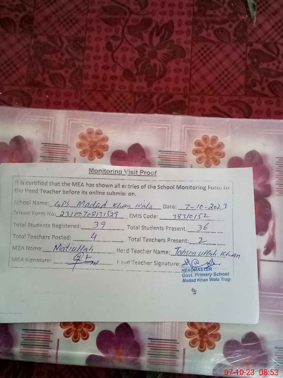 | EMIS Code: 38310152 | Name of School: GPS MADAD KHAN WALA PO TRAG ISA KHEL MIANWALI | |||