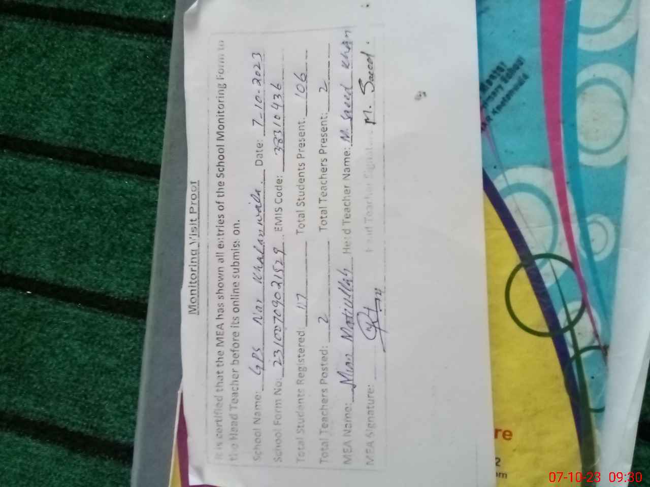 | Attendance Register | Head Teacher | MEA with School | Visit Proof |