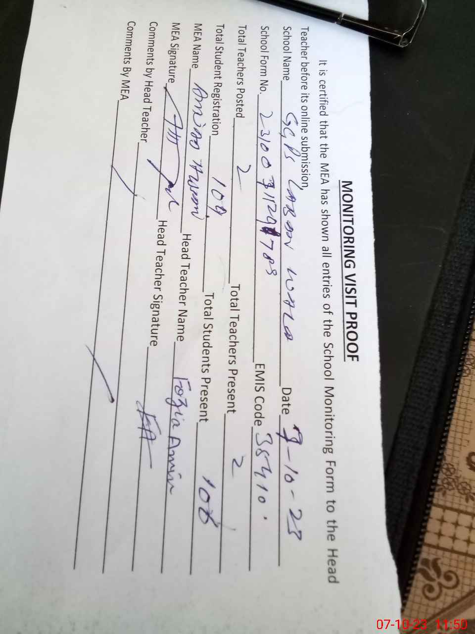 | Attendance Register | Head Teacher | MEA with School | Visit Proof |