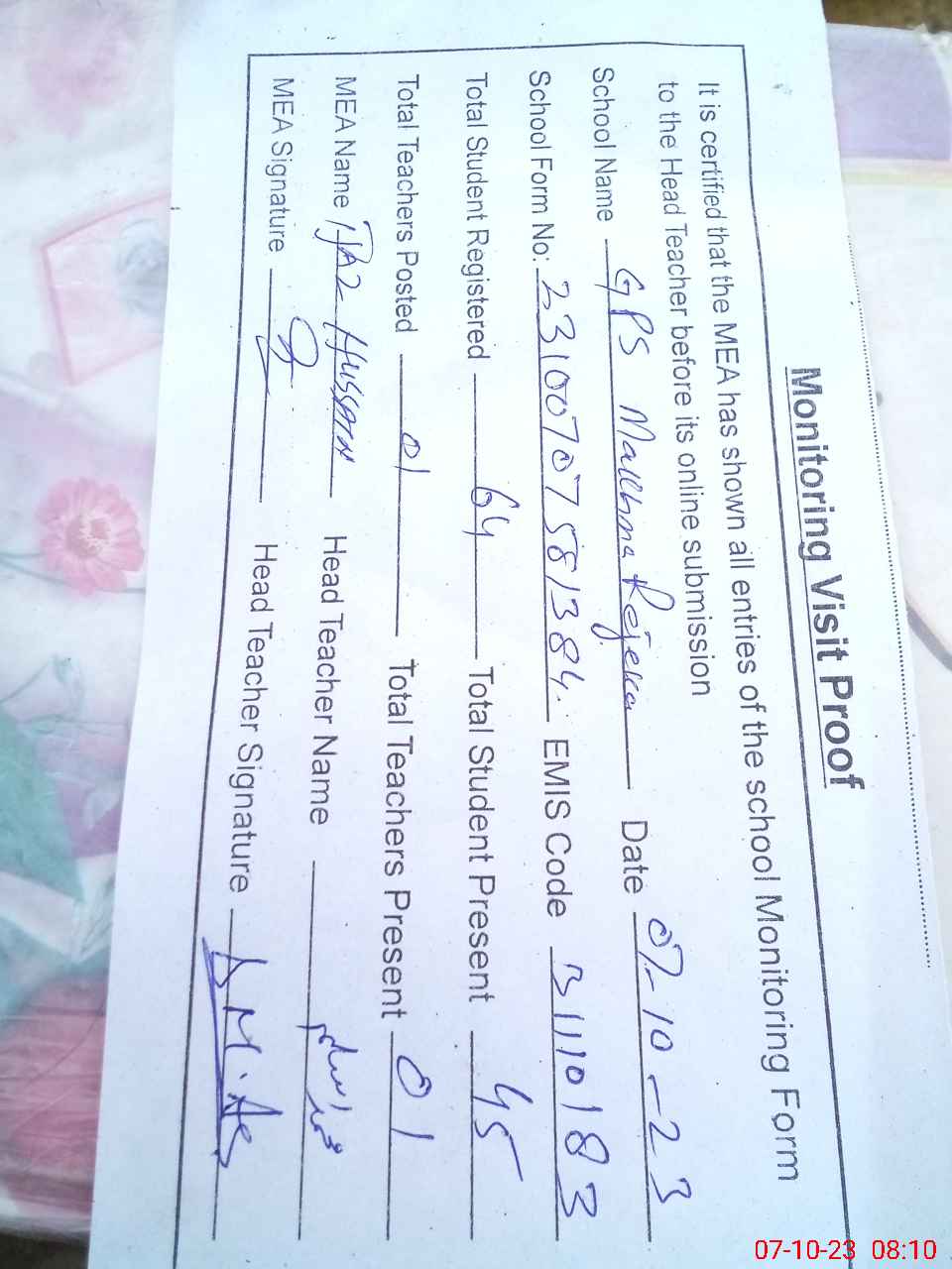 | Certified that this School was Inspected by the Undersigned MEA/DMO Today and the Information Stated Above is as Per Record. | |||||