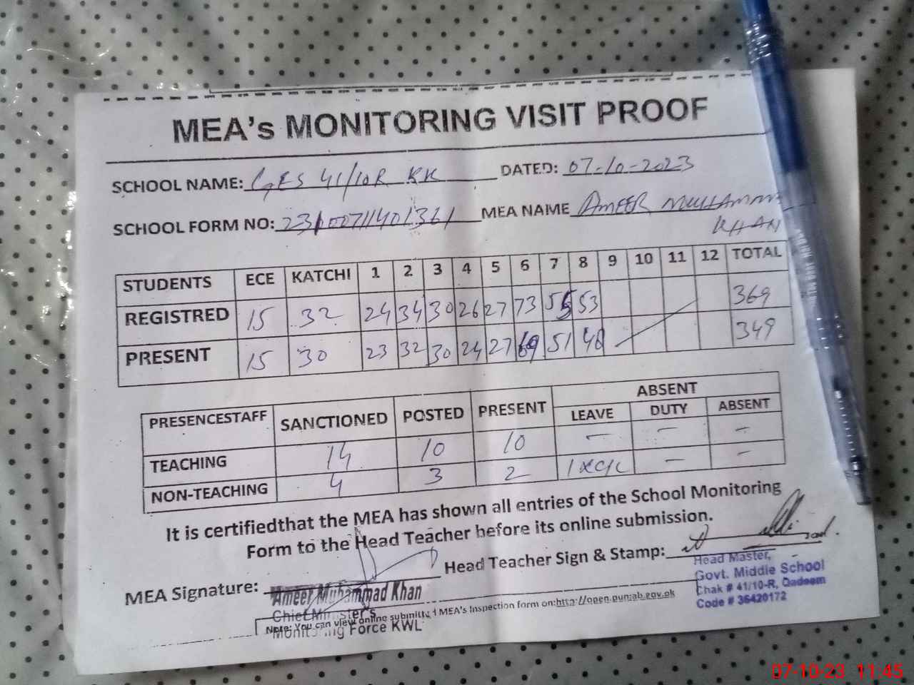 | Certified that this School was Inspected by the Undersigned MEA/DMO Today and the Information Stated Above is as Per Record. | |||||