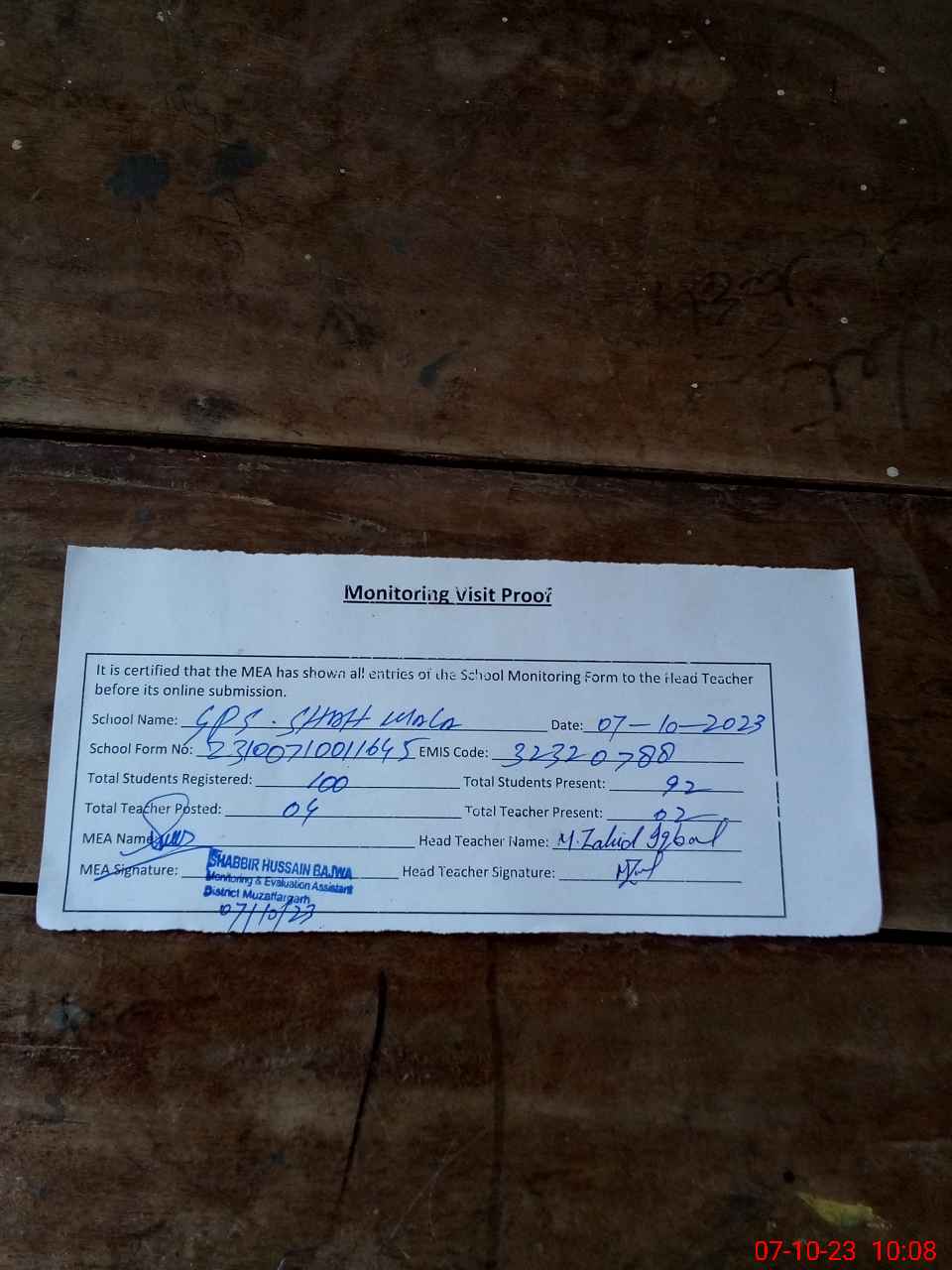 | EMIS Code: 32320788 | Name of School: GPS SHAH WALA | |||