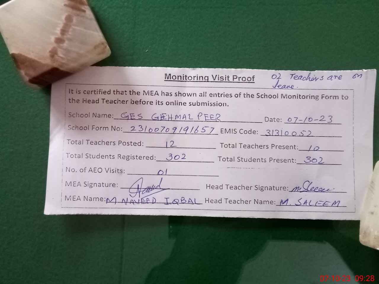 | EMIS Code: 31310052 | Name of School: GES GEHMAL PEER | |||