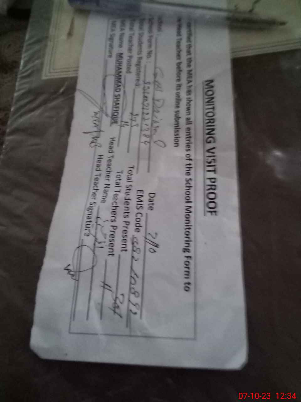 | Attendance Register | Head Teacher | MEA with School | Visit Proof |