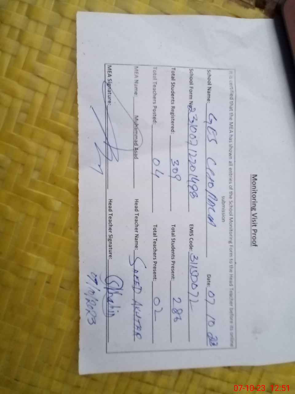 | Attendance Register | Head Teacher | MEA with School | Visit Proof |