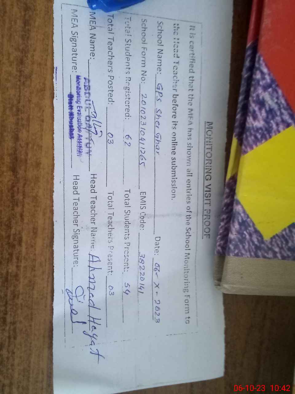 | Attendance Register | Head Teacher | MEA with School | Visit Proof |