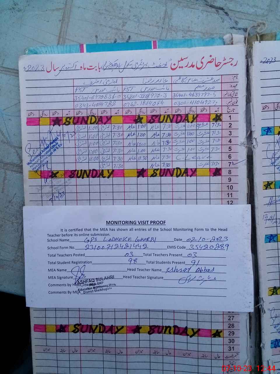 | District: SHEIKHUPURA | Tehsil: MURIDKE | Markaz: MEHTA SUJA-MALE | Level: Primary | |