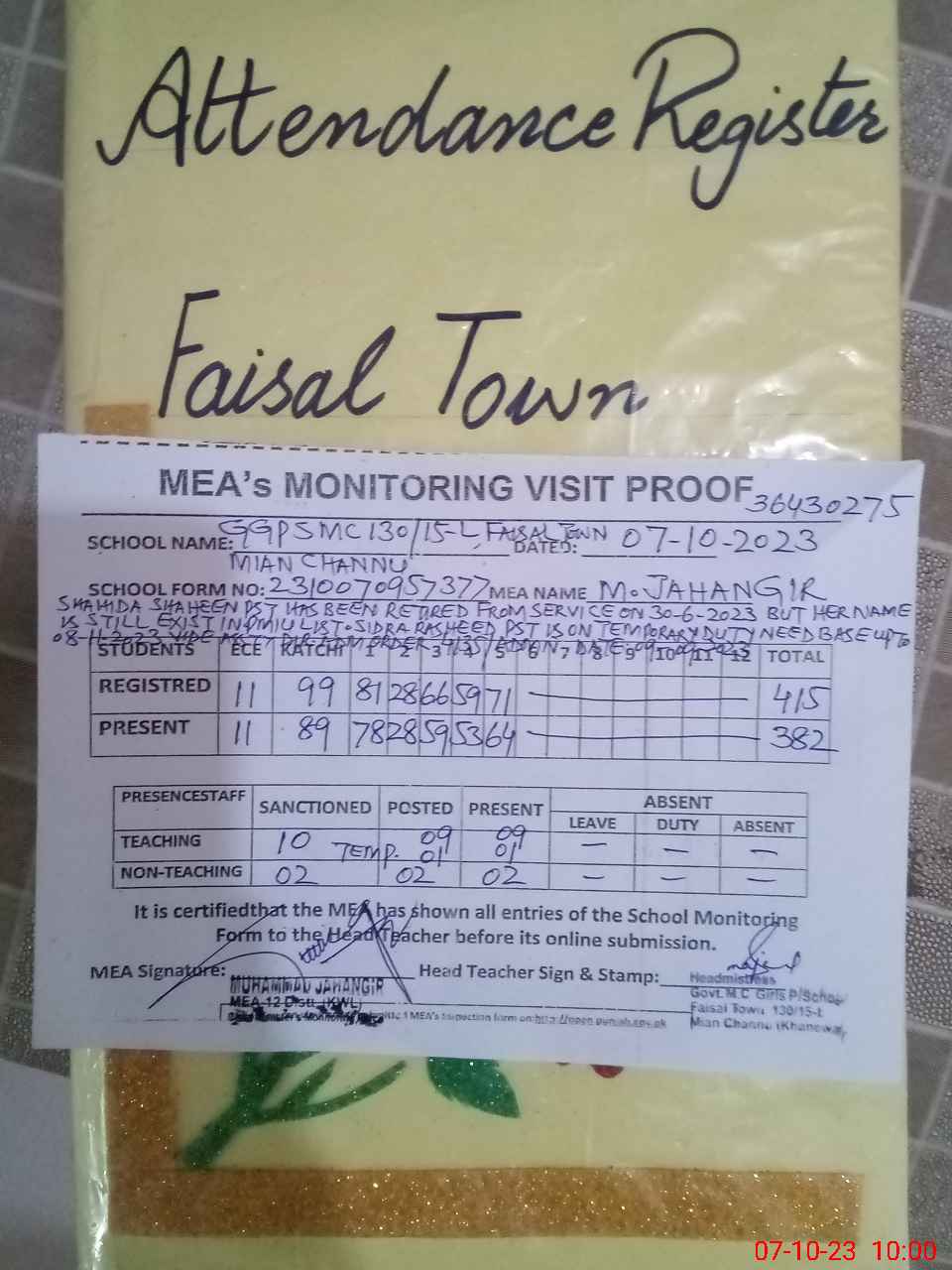 | Attendance Register | Head Teacher | MEA with School | Visit Proof |