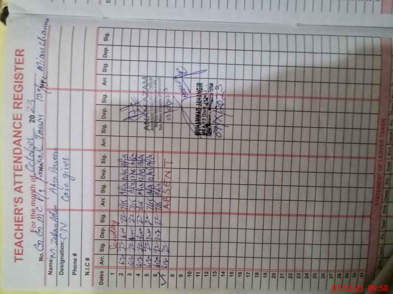 | Remarks (Use Separate Page if Required): SHAHIDA SHAHEEN PST HAS BEEN RETIRED FROM SERVICE ON 30 JUNE 2023 BUT HER NAME IS STILL EXIST IN PMIU LIST MEA TAB LIST SIDRA RASHEED PST IS ON TEMPORARY DUTY NEED BASE UPTO 08 NOVEMBER 2023 FROM GGPS BAGHDAD NO 2 TULAMBA VIDE ASSTT DIRECTOR ADMIN KHANEWAL ORDER NO 4135 ADMN DATED 09 SEPTEMBER 2023 CAREGIVER AFIA PARVEEN FOUND ABSENT FROM DUTY HER STAFF ATTENDANCE REGISTER COLUMNS WERE LEFT BLANK FTF RECORDS IS NOT MAINTAINED RANDOM CLASS KATCHI IS NOW IN CLASS ONE AND TWO | |||||
