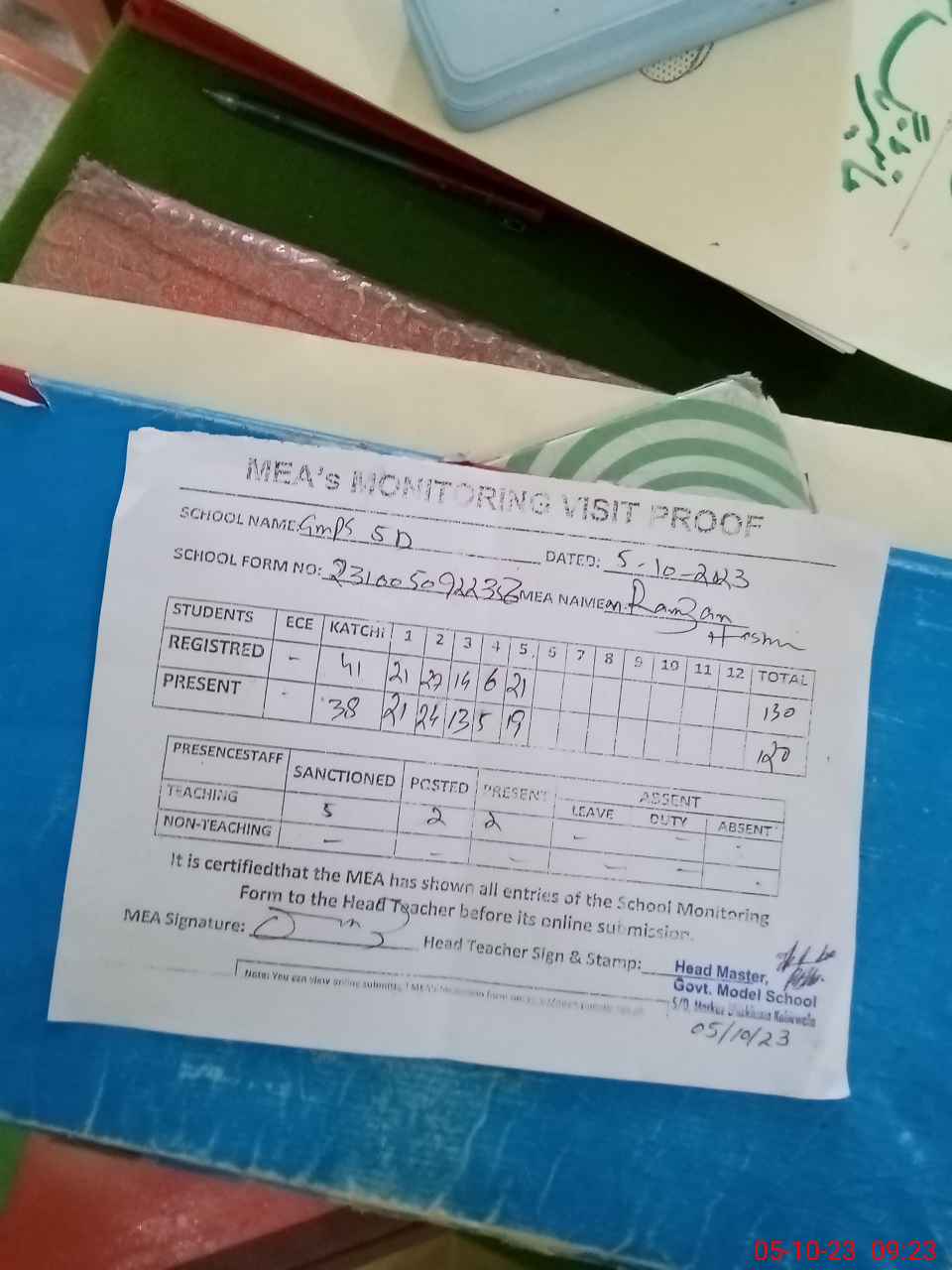 | Attendance Register | Head Teacher | MEA with School | Visit Proof |