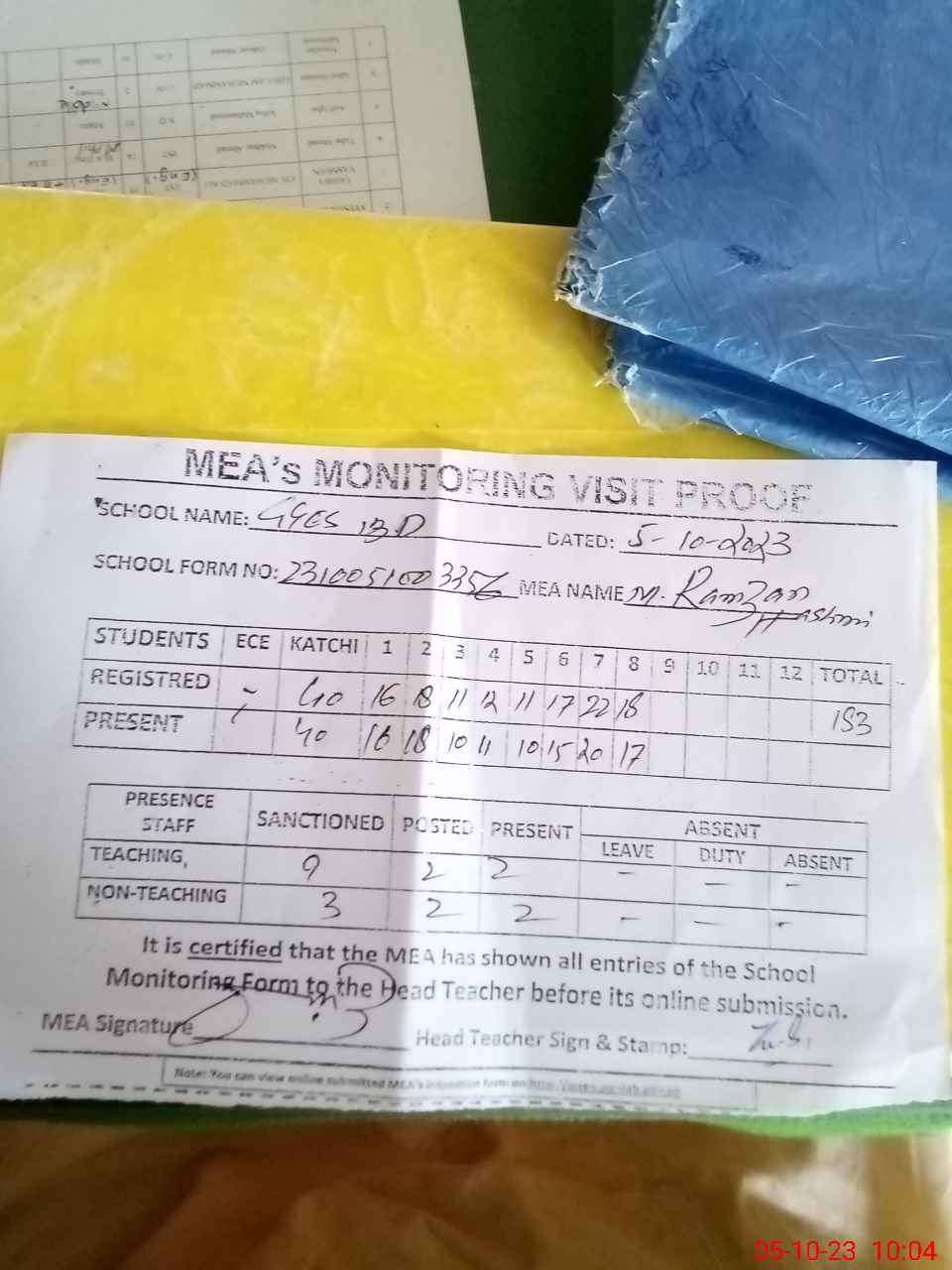 | Attendance Register | Head Teacher | MEA with School | Visit Proof |