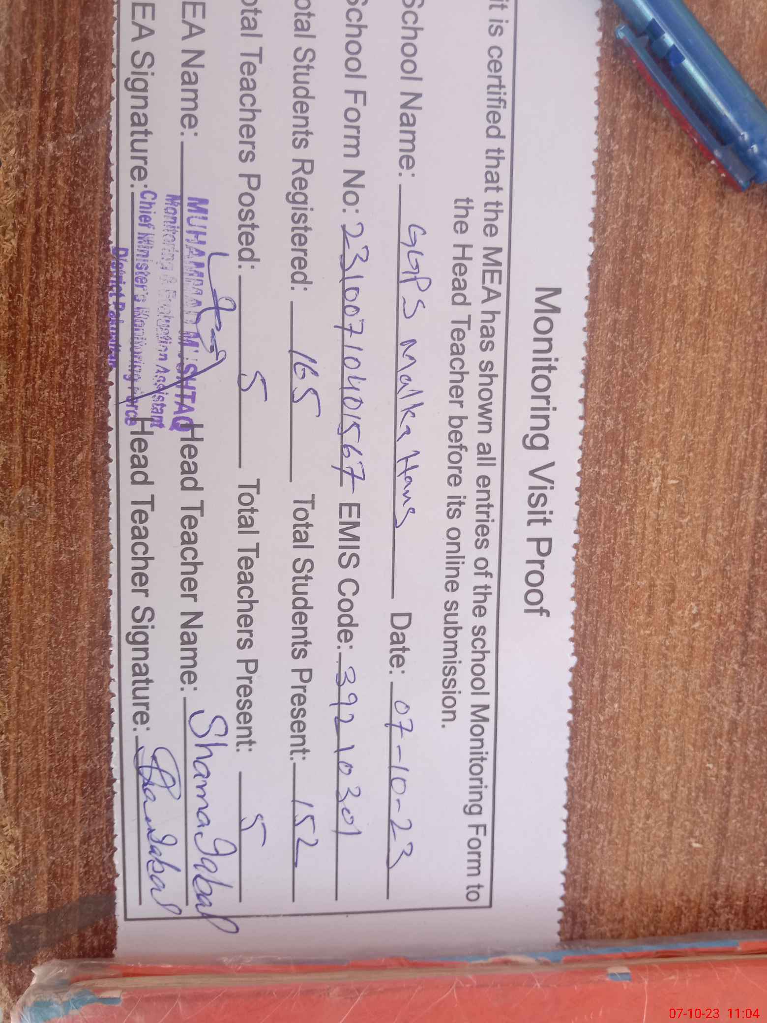 | Certified that this School was Inspected by the Undersigned MEA/DMO Today and the Information Stated Above is as Per Record. | |||||
