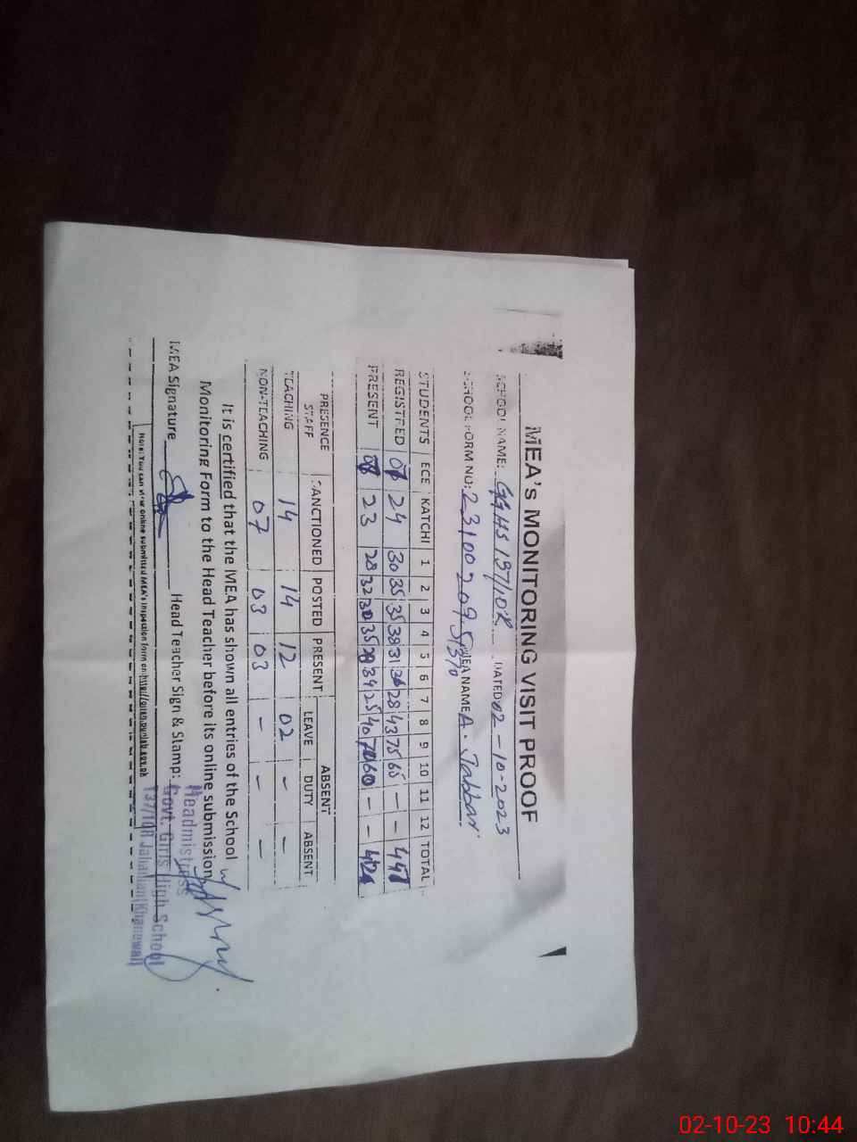 | Attendance Register | Head Teacher | MEA with School | Visit Proof |
