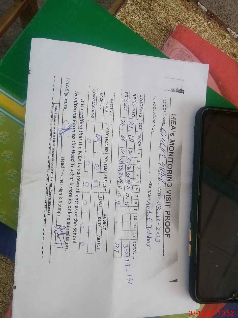 | Attendance Register | Head Teacher | MEA with School | Visit Proof |