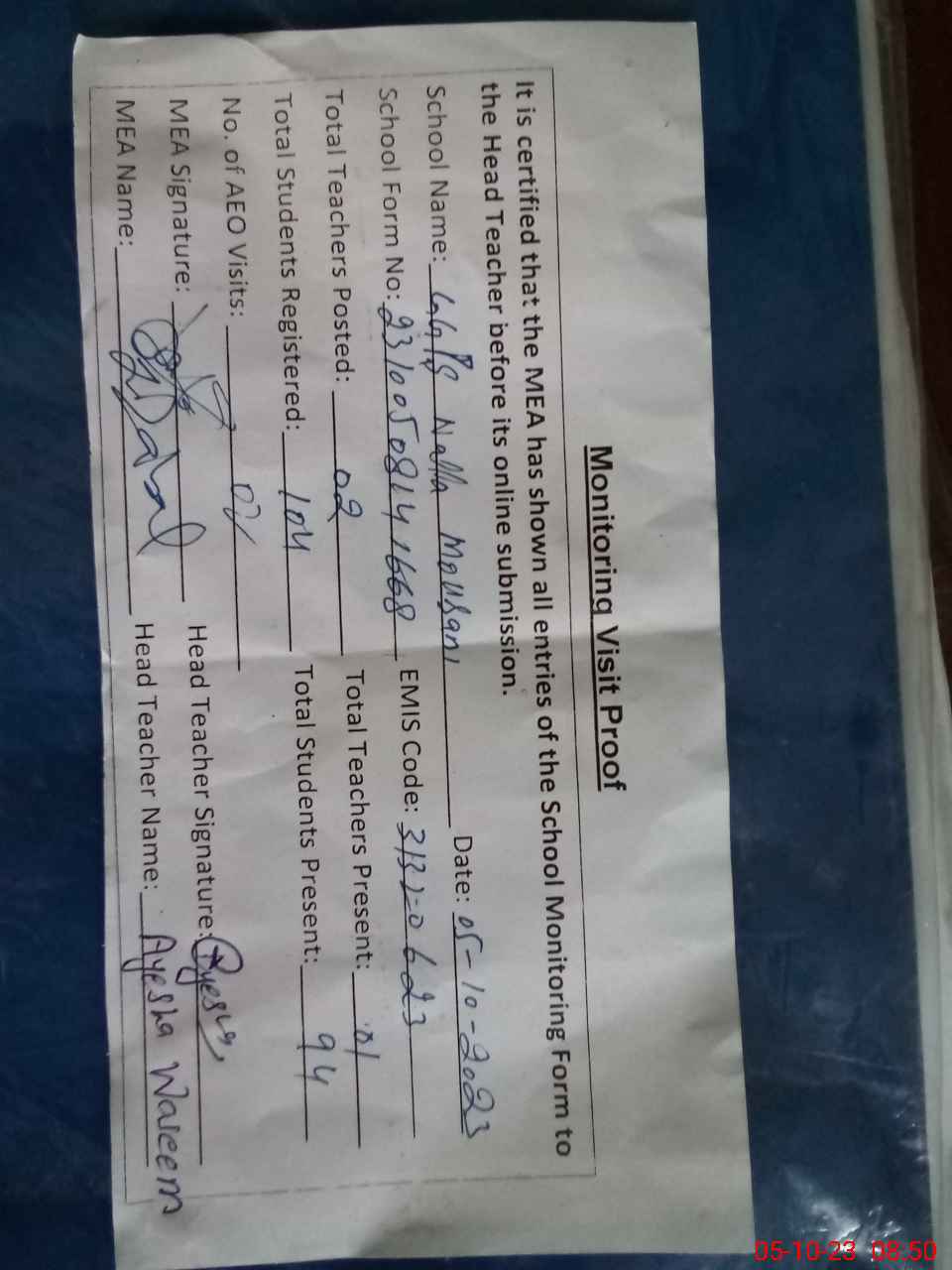 | Certified that this School was Inspected by the Undersigned MEA/DMO Today and the Information Stated Above is as Per Record. | |||||