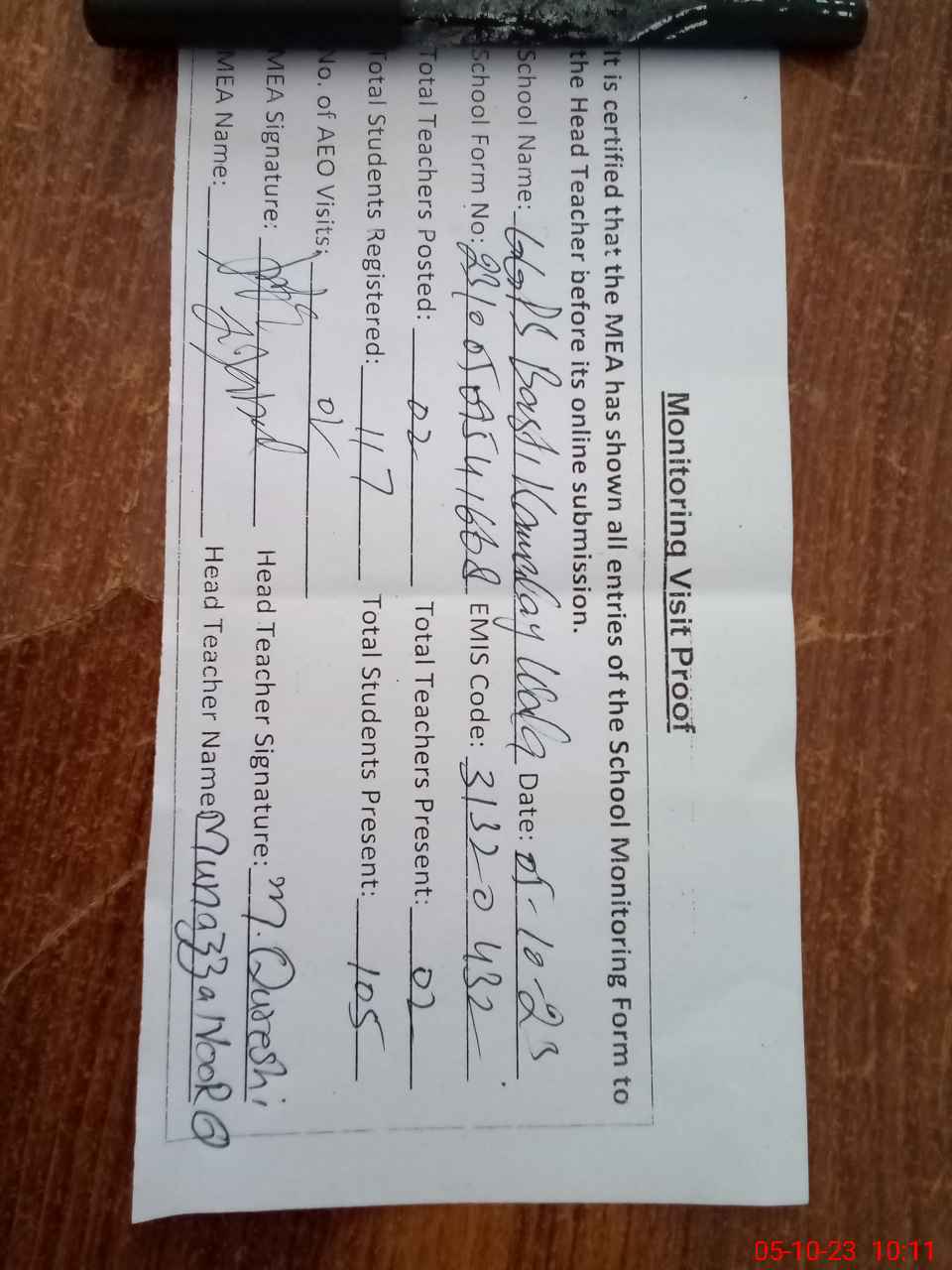 | Monitoring Date: 05-10-2023 | Start Time: 05-10-2023 09:49 AM | End Time: 05-10-2023 10:11 AM | Name of MEA: Za**** Iq**** | |