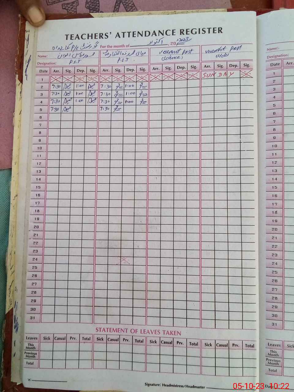 | Name: M.AB**** Designation: (School Headmaster's/Headmistress's) PST Phone/Cell Number: 03**** |
