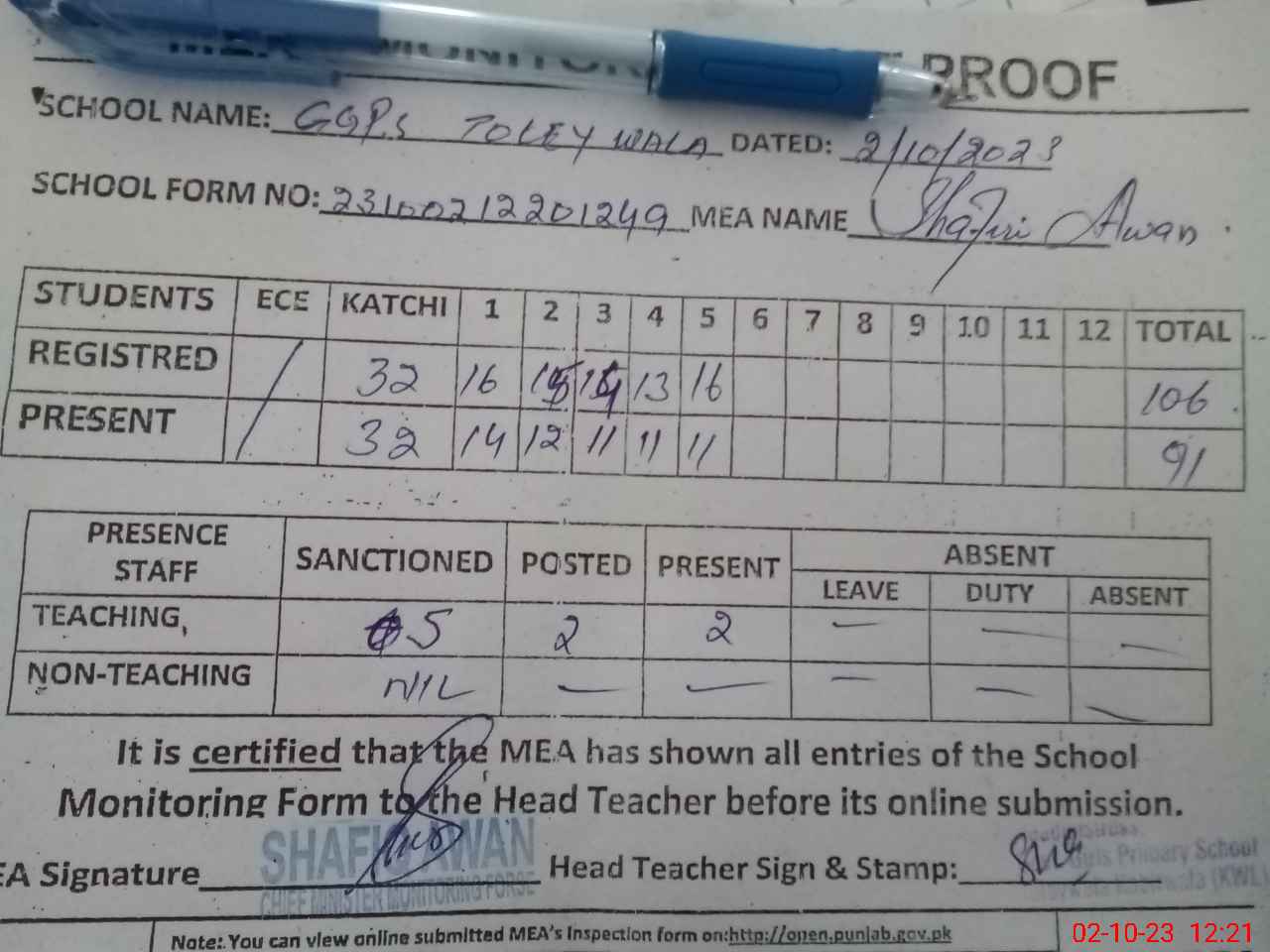 | Attendance Register | Head Teacher | MEA with School | Visit Proof |