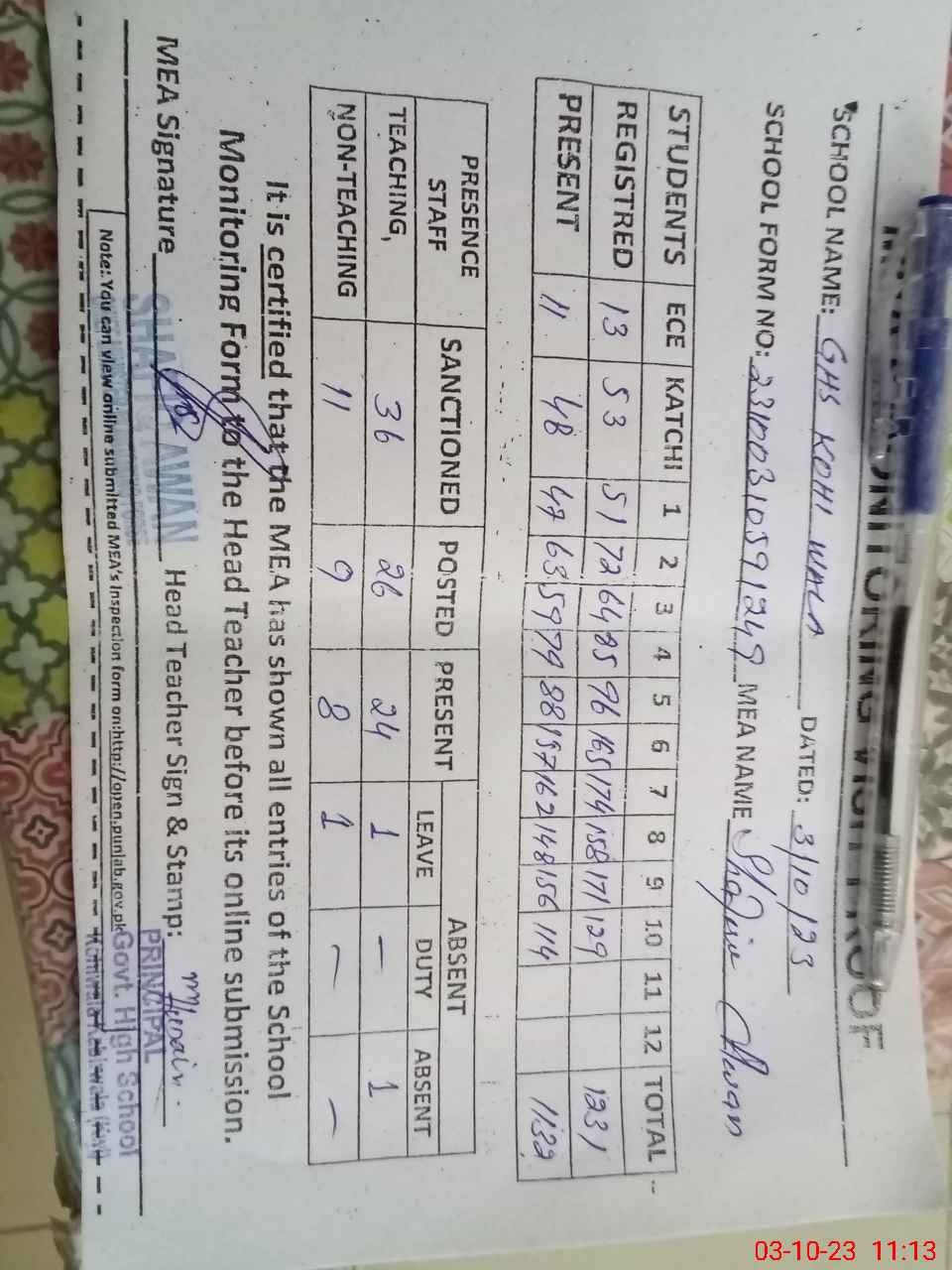 | EMIS Code: 36410006 | Name of School: GHS KOHI WALA, KABIRWALA | |||