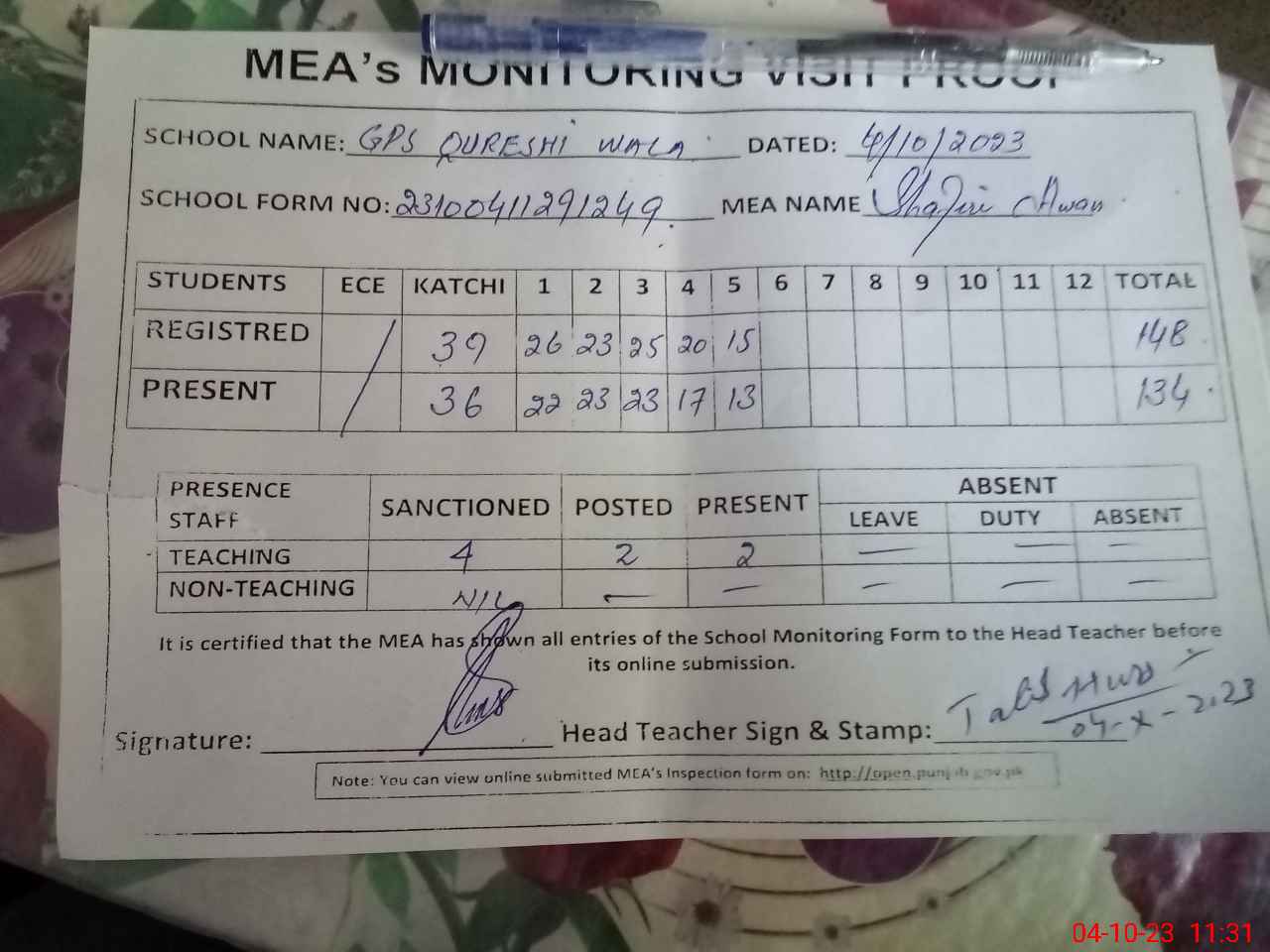 | Attendance Register | Head Teacher | MEA with School | Visit Proof |