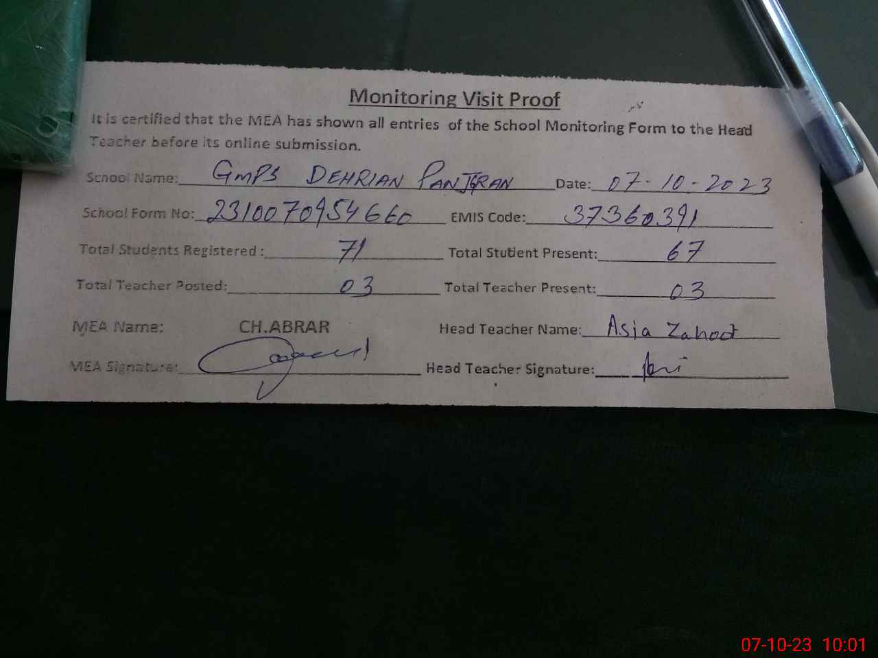 | Attendance Register | Head Teacher | MEA with School | Visit Proof |