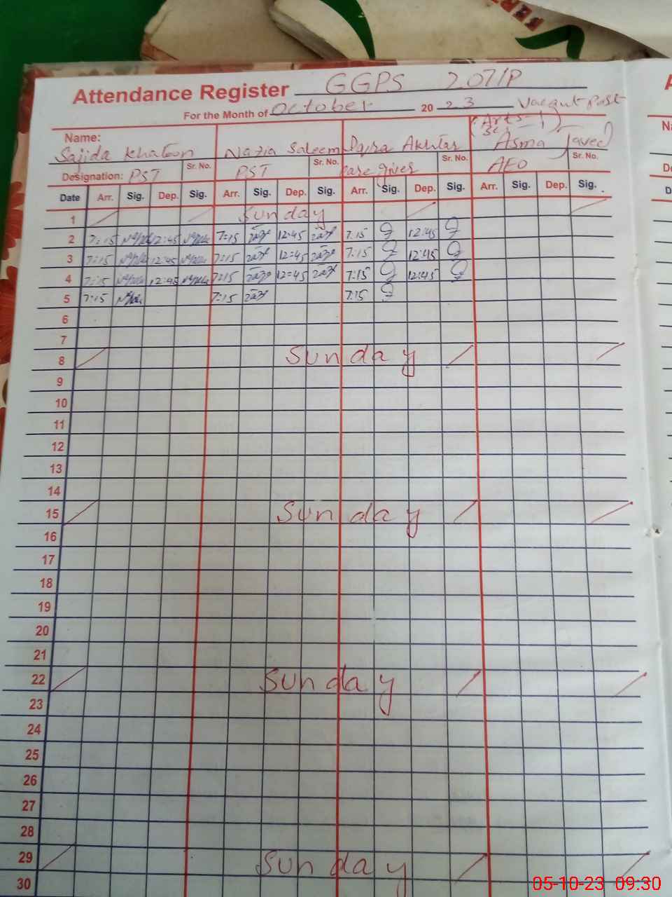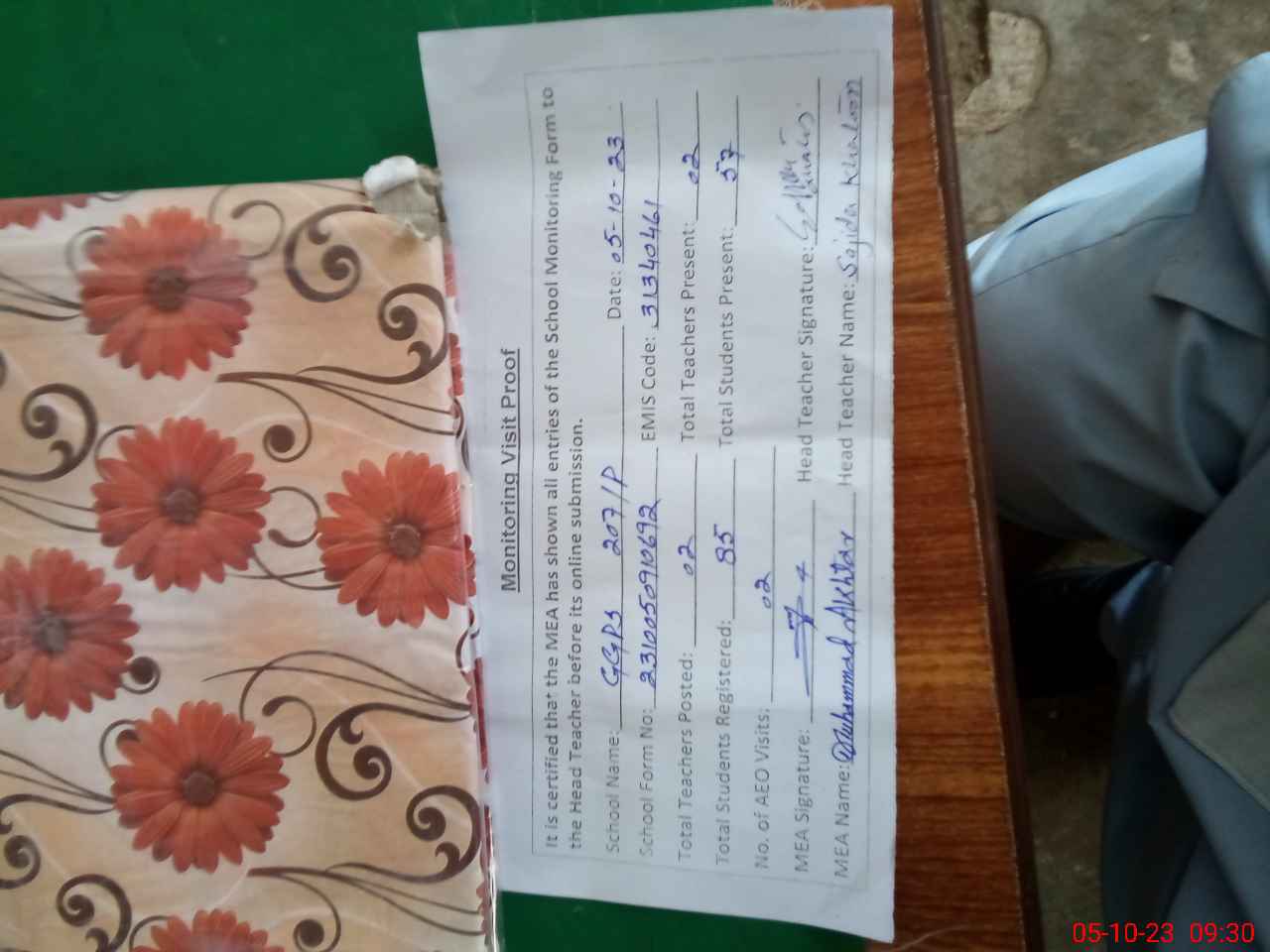 | Monitoring Date: 05-10-2023 | Start Time: 05-10-2023 09:10 AM | End Time: 05-10-2023 09:30 AM | Name of MEA: Mu**** Ak**** | |