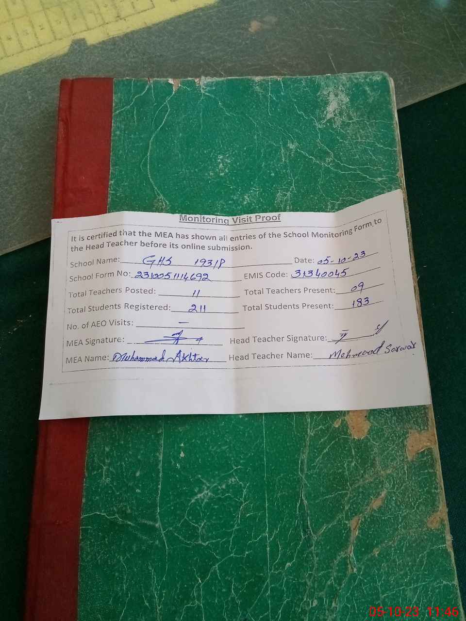 | Attendance Register | Head Teacher | MEA with School | Visit Proof |
