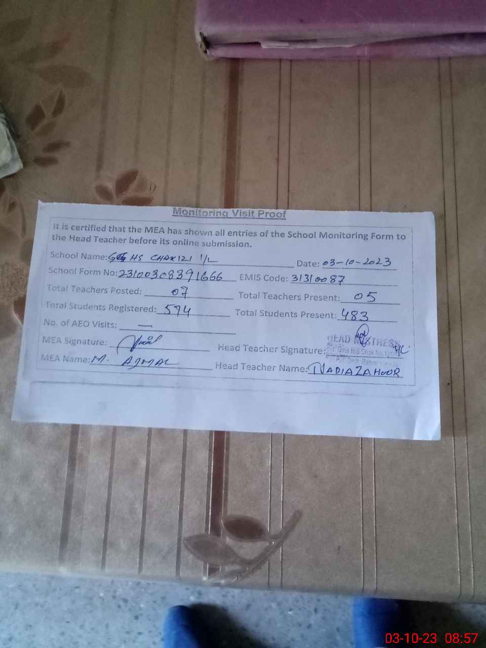 | Attendance Register | Head Teacher | MEA with School | Visit Proof |