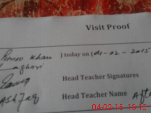 | School Visited by School Health & Nutrition Supervisor (No. of Visits) | 1 | Name1: | Muhammad Kamran | Name2: | Nil |
