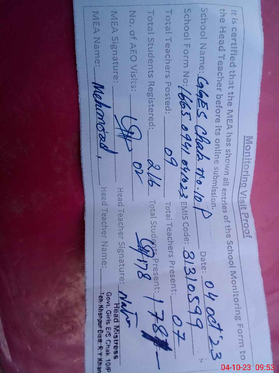 | EMIS Code: 31310599 | Name of School: GGES CHAK NO.10/P | |||