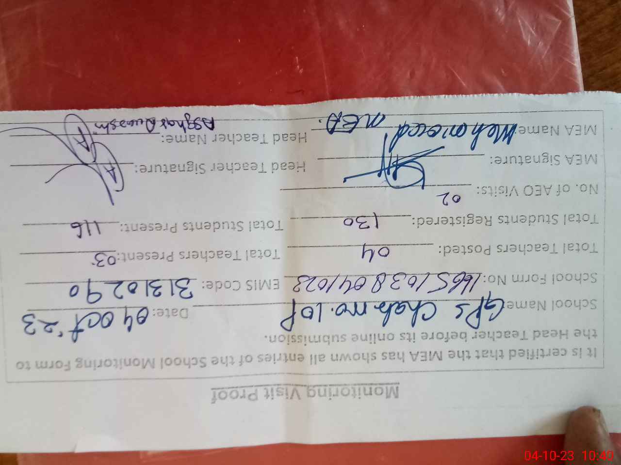 | Attendance Register | Head Teacher | MEA with School | Visit Proof |