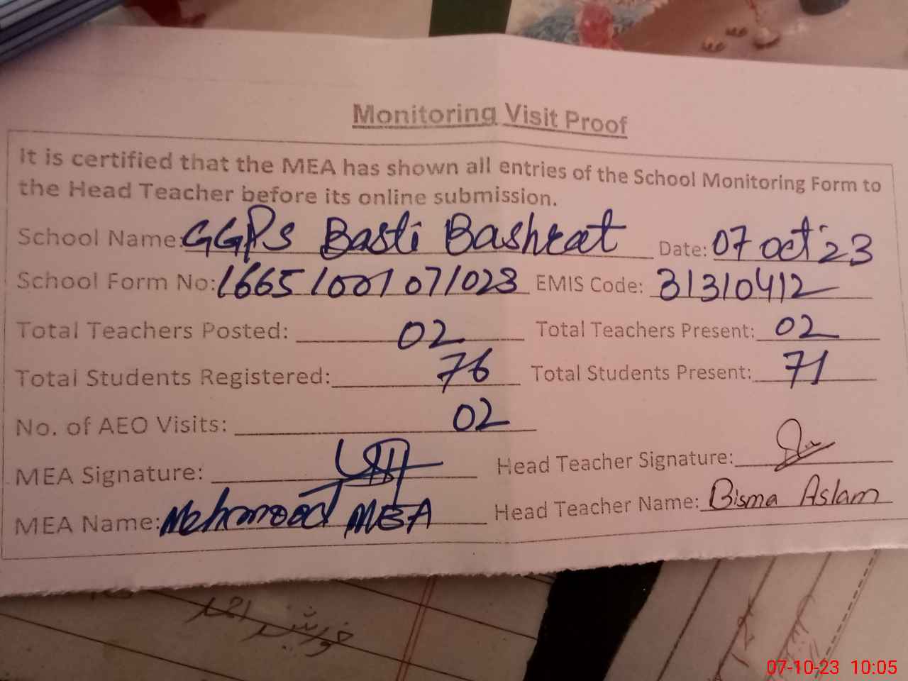 | Monitoring Date: 07-10-2023 | Start Time: 07-10-2023 09:35 AM | End Time: 07-10-2023 10:05 AM | Name of MEA: Ma**** UlHa**** | |