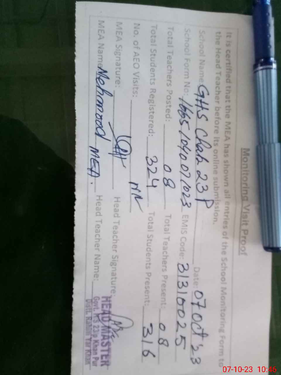 | EMIS Code: 31310025 | Name of School: GHS CHAK NO. 23/P | |||