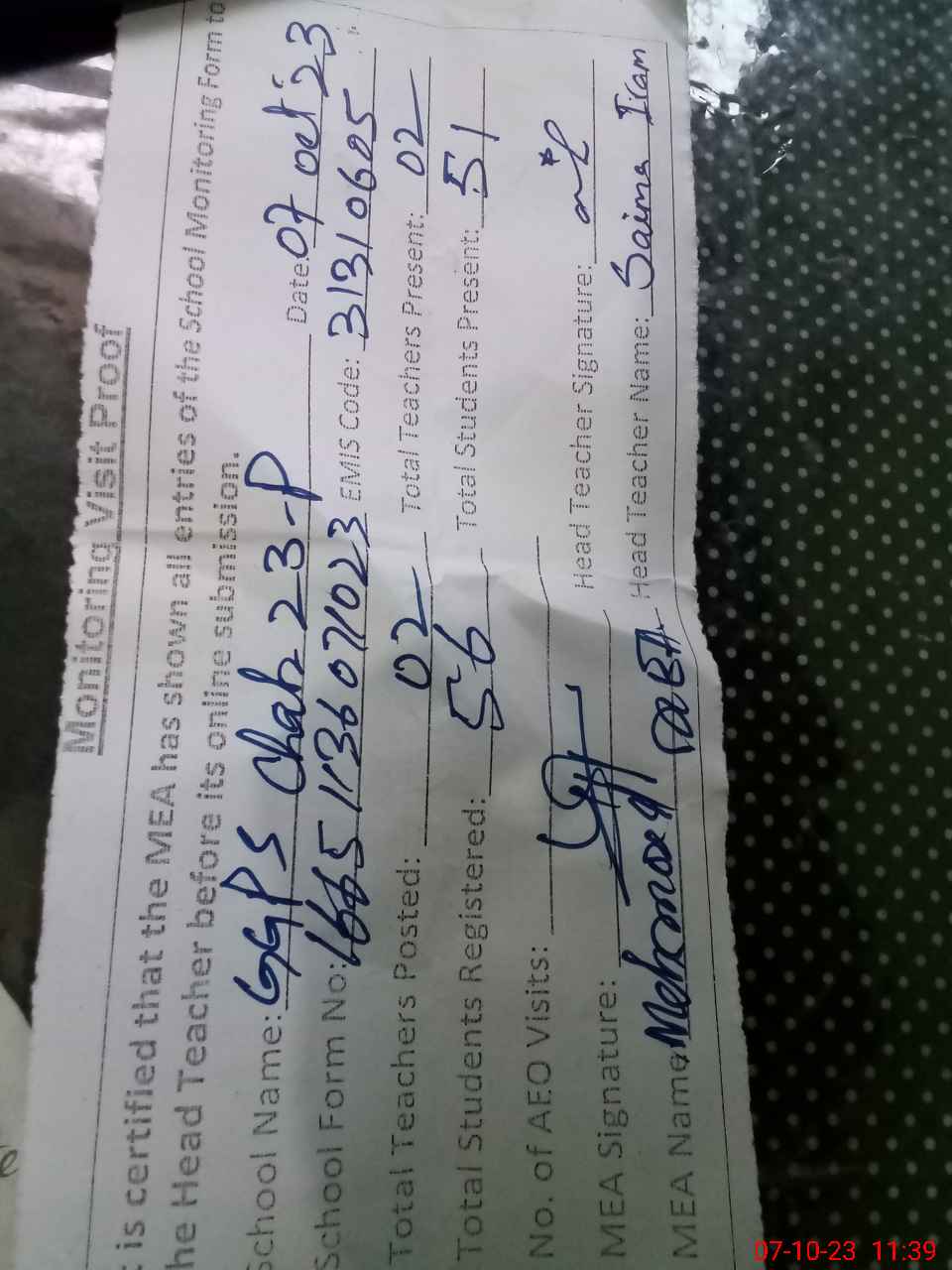 | Monitoring Date: 07-10-2023 | Start Time: 07-10-2023 11:22 AM | End Time: 07-10-2023 11:40 AM | Name of MEA: Ma**** UlHa**** | |