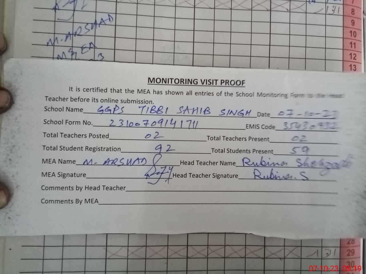 | Attendance Register | Head Teacher | MEA with School | Visit Proof |