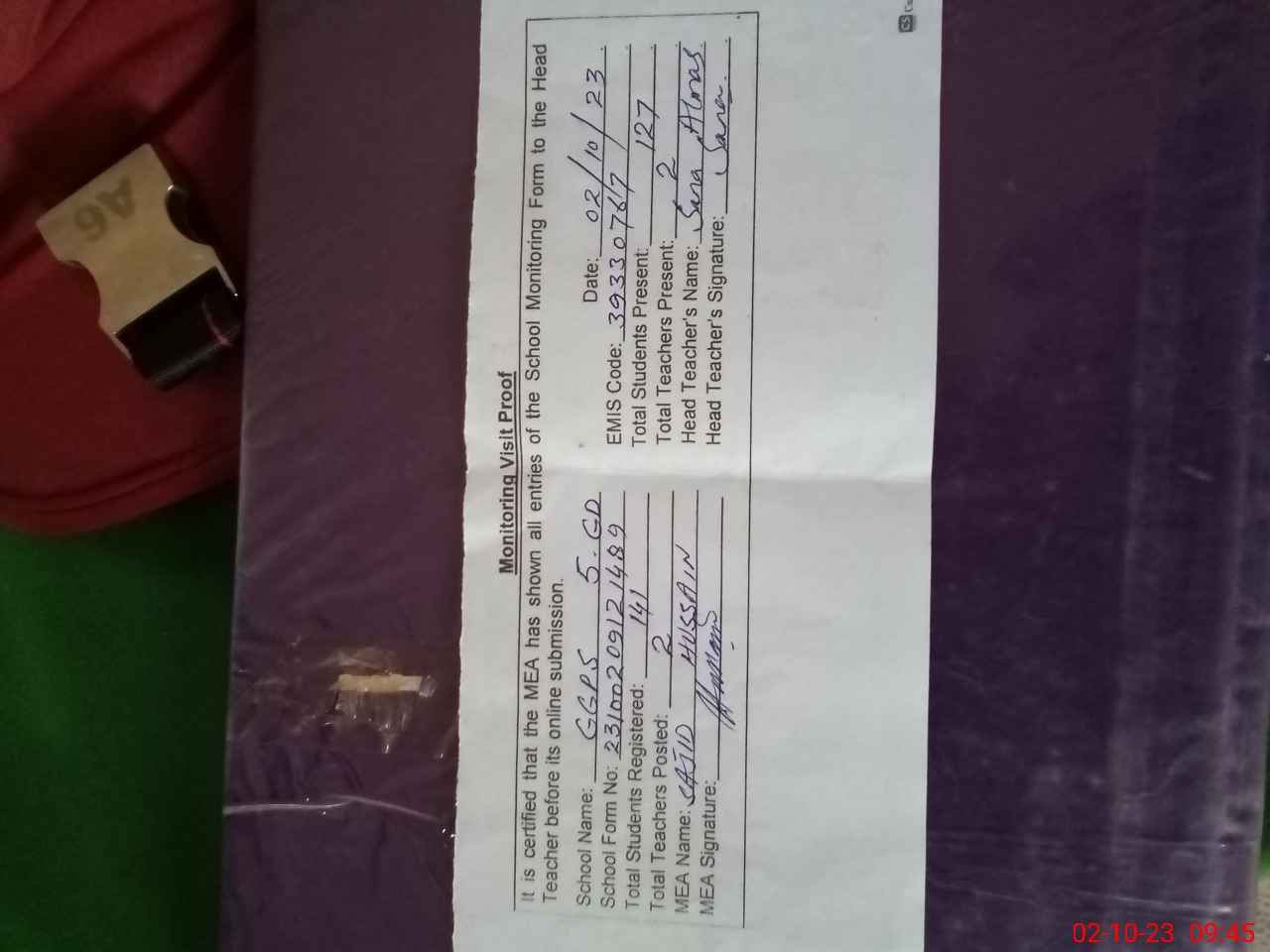 | Attendance Register | Head Teacher | MEA with School | Visit Proof |