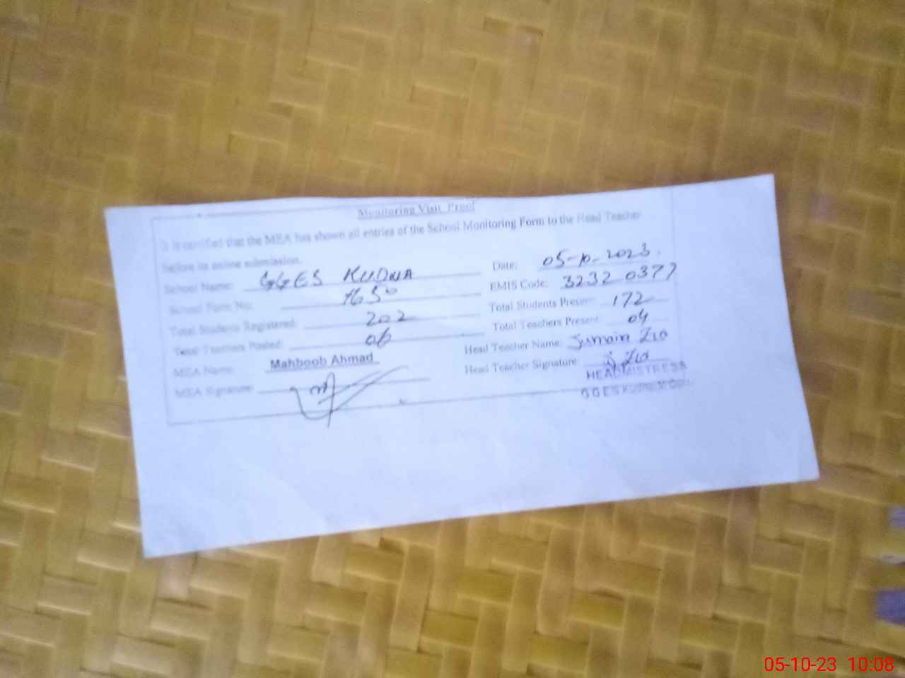 | Monitoring Date: 05-10-2023 | Start Time: 05-10-2023 09:37 AM | End Time: 05-10-2023 10:12 AM | Name of MEA: MA**** AH**** | |