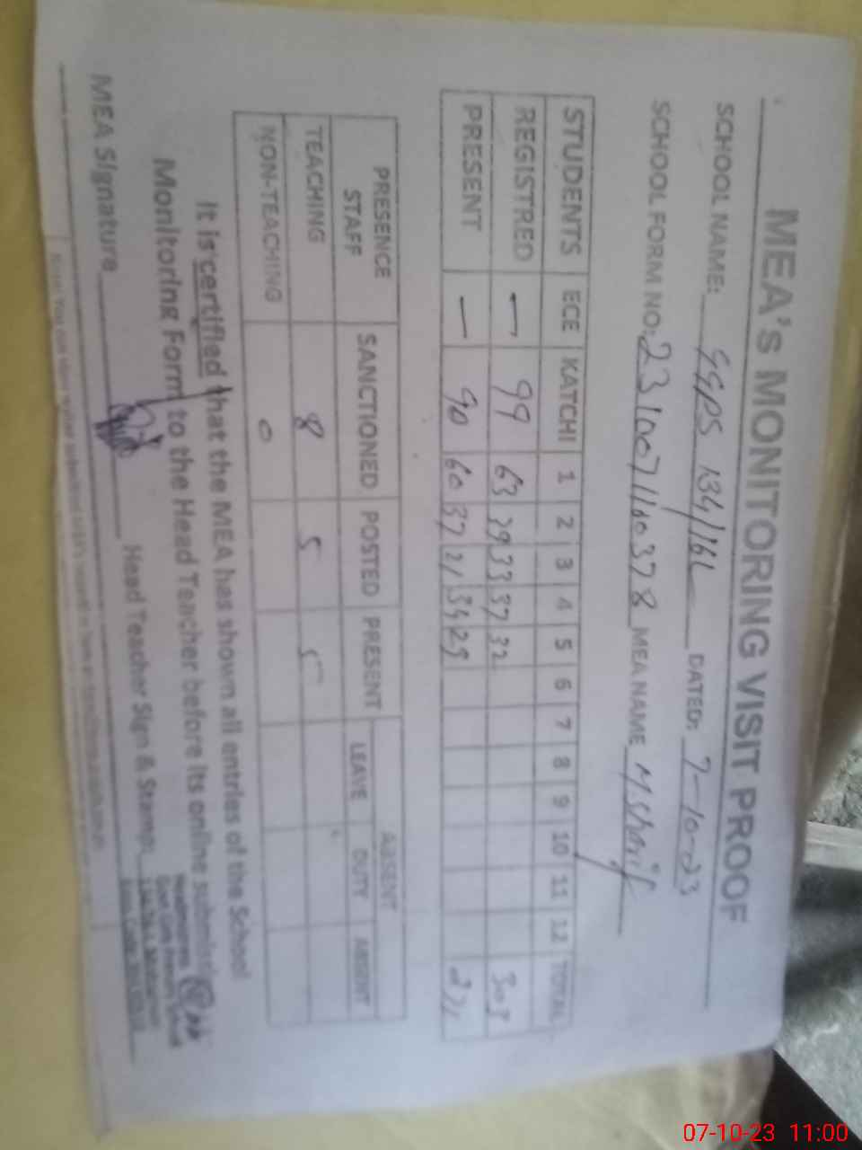 | Attendance Register | Head Teacher | MEA with School | Visit Proof |