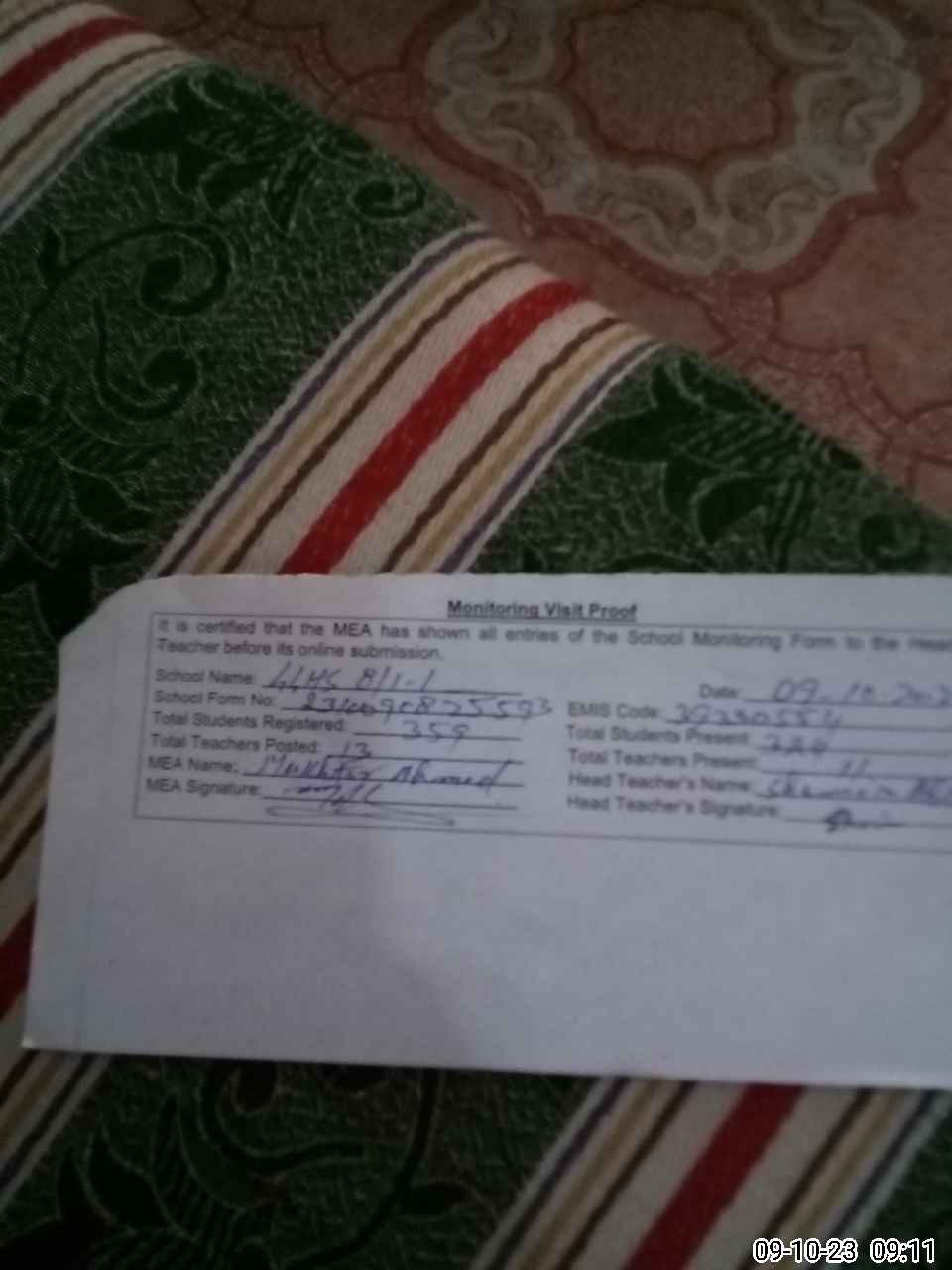 | Certified that this School was Inspected by the Undersigned MEA/DMO Today and the Information Stated Above is as Per Record. | |||||