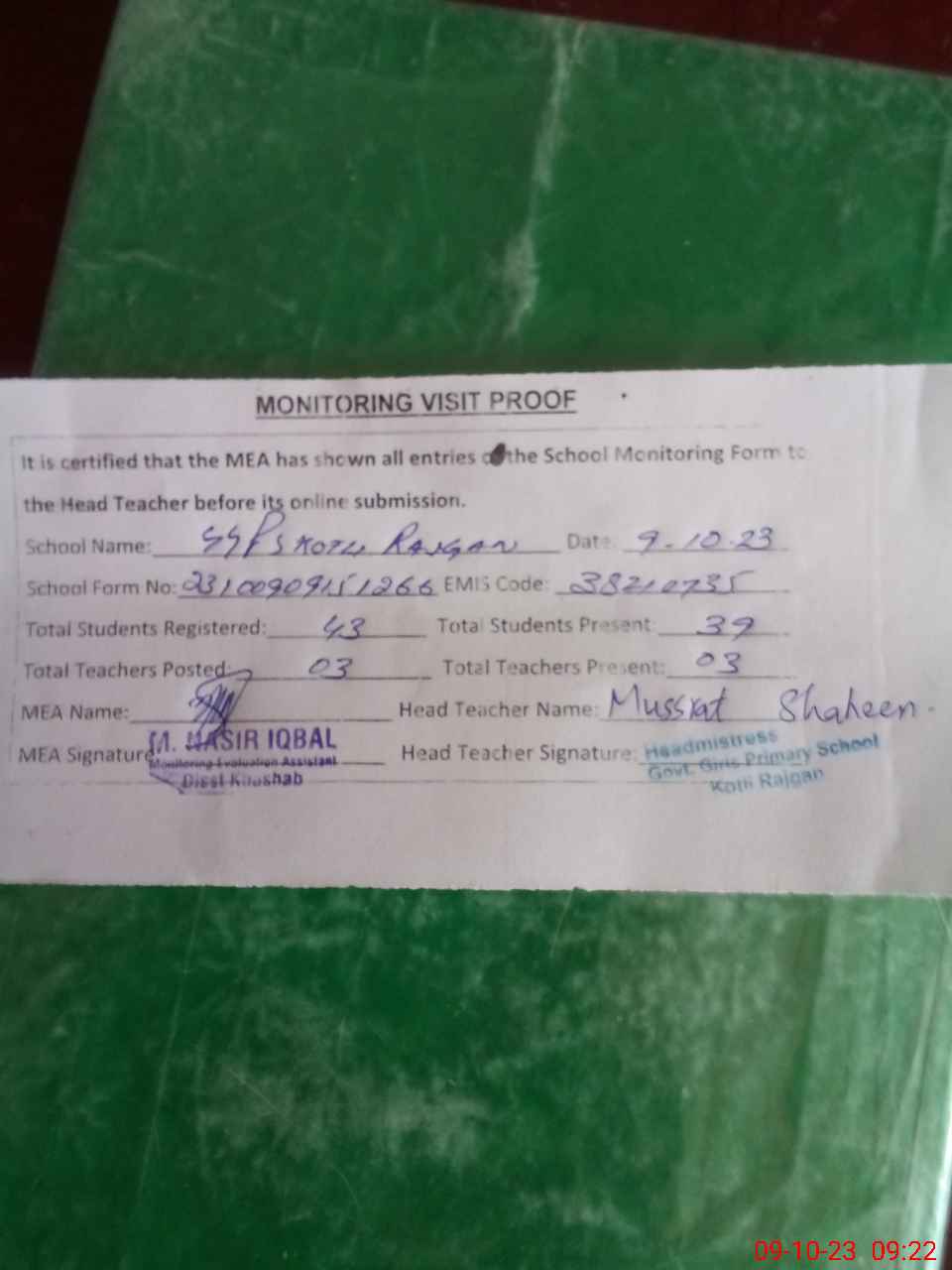 | Attendance Register | Head Teacher | MEA with School | Visit Proof |