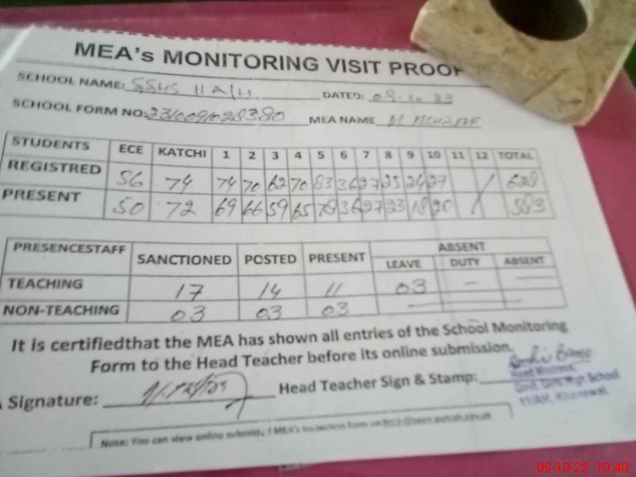 | Attendance Register | Head Teacher | MEA with School | Visit Proof |