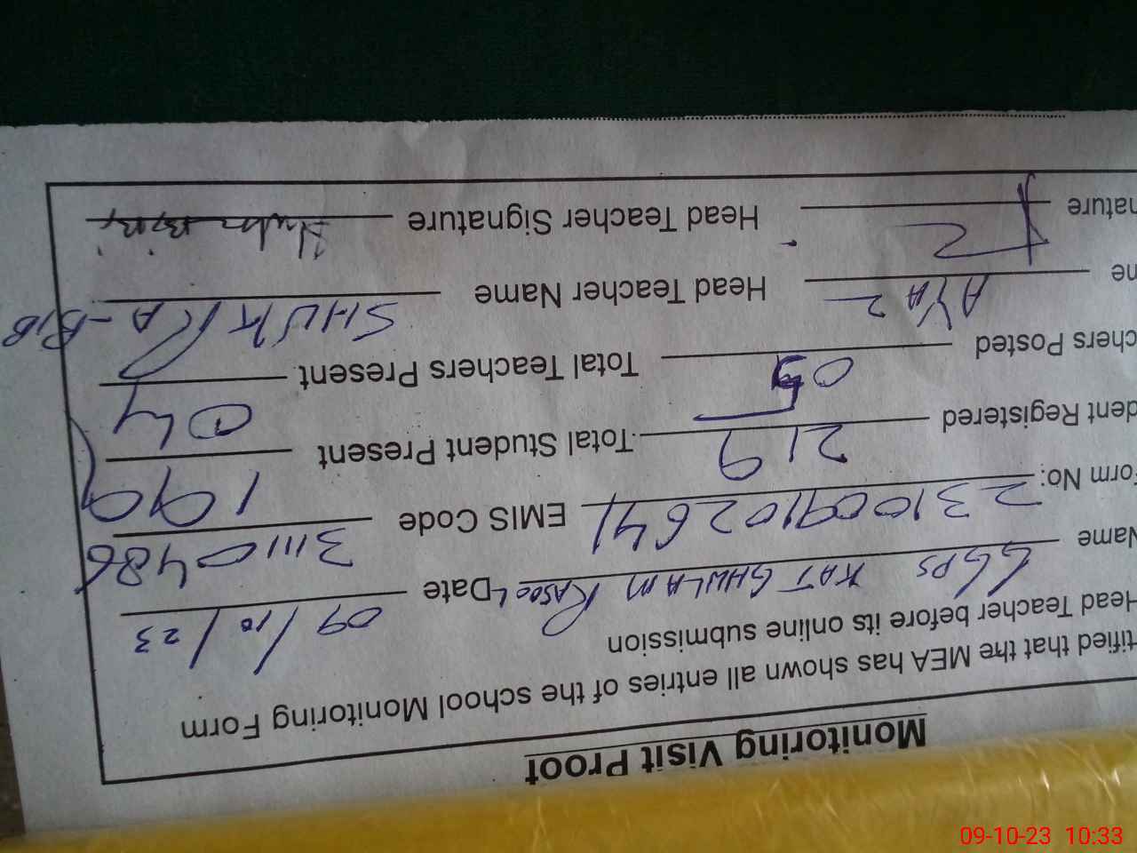 | Name: Sh**** Bi**** Designation: (School Headmaster's/Headmistress's) P S T Phone/Cell Number: 03**** |