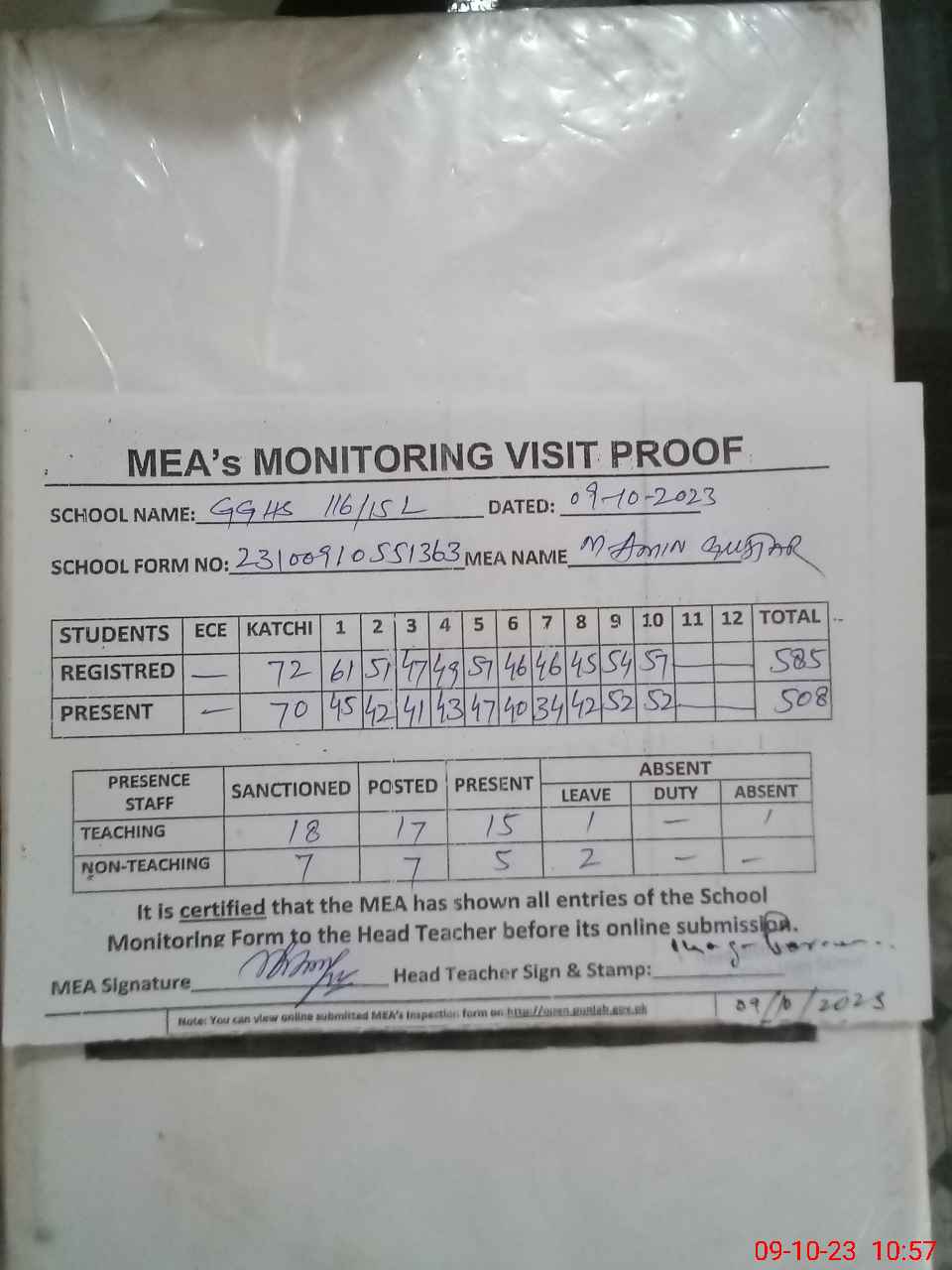 | Attendance Register | Head Teacher | MEA with School | Visit Proof |