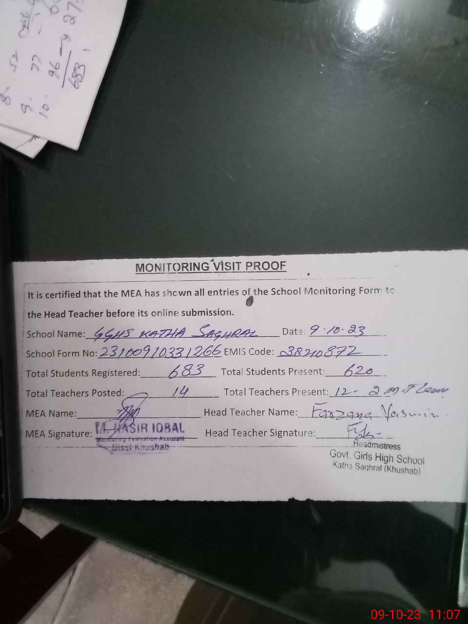 | Attendance Register | Head Teacher | MEA with School | Visit Proof |