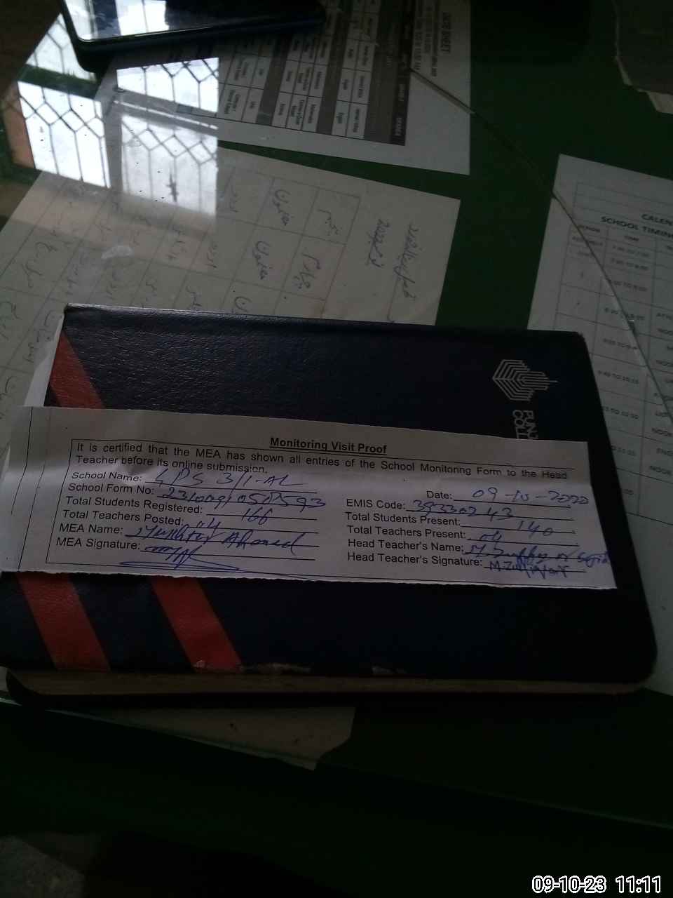 | Attendance Register | Head Teacher | MEA with School | Visit Proof |