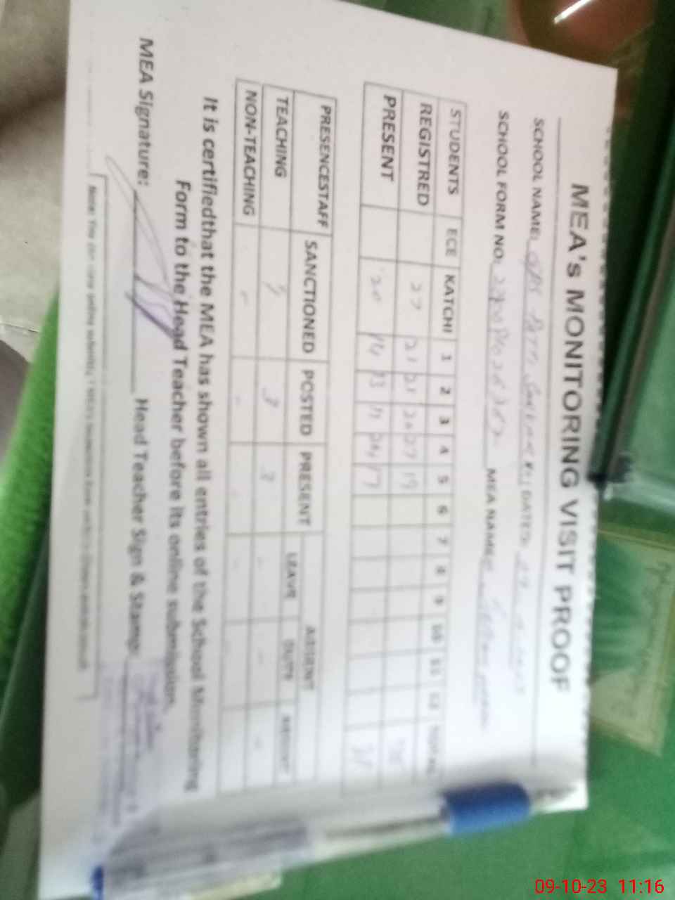 | Attendance Register | Head Teacher | MEA with School | Visit Proof |