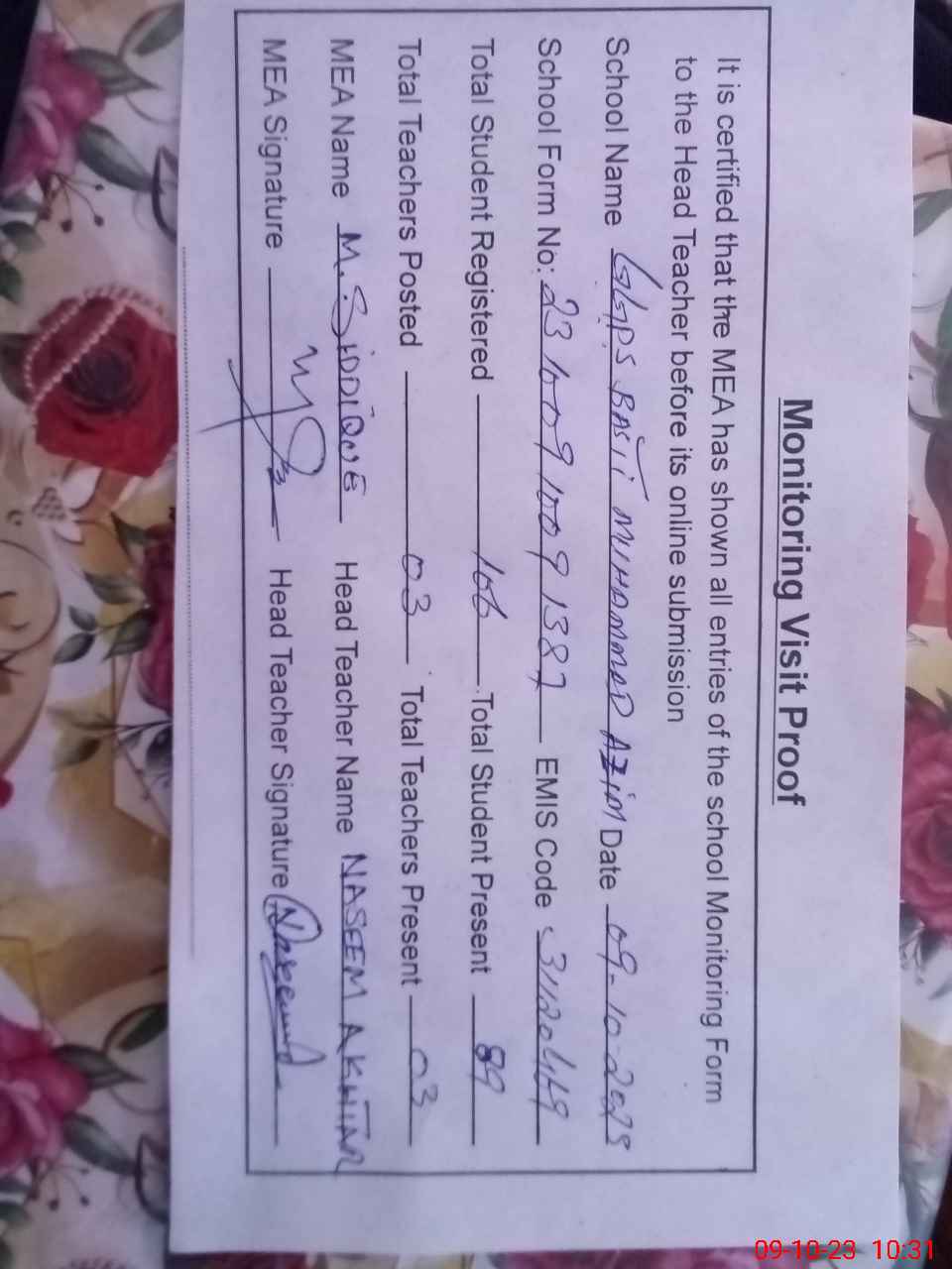 | Certified that this School was Inspected by the Undersigned MEA/DMO Today and the Information Stated Above is as Per Record. | |||||