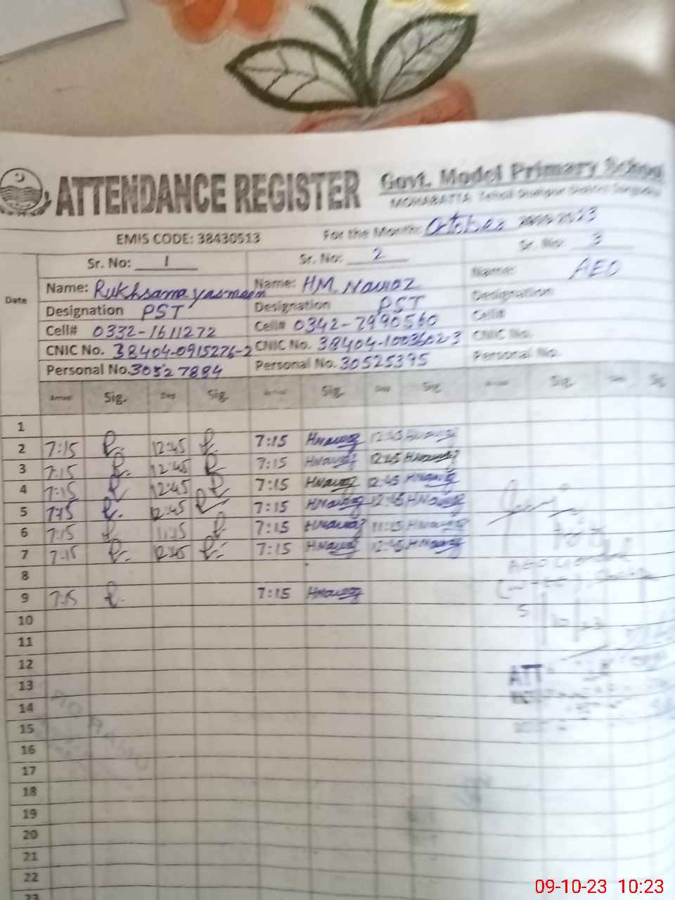 | CNIC | Full Name | Designation | R/C | Absence during last cal. month |